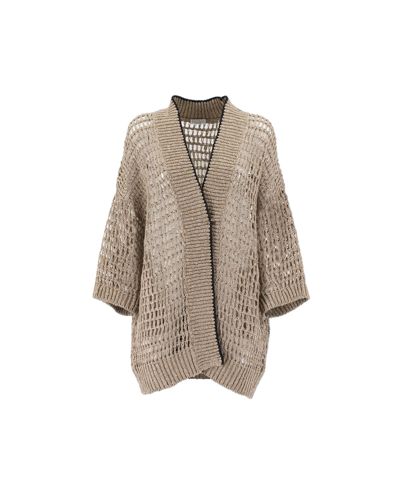 Cardigan made of Dazzling Rustic Net fabric that embodies the essence of summer knitwear, light and feminine with a shiny touch given by the sequins, horn button fastening, V neck, regular fit. Composition: 58% LI, 42% SE
