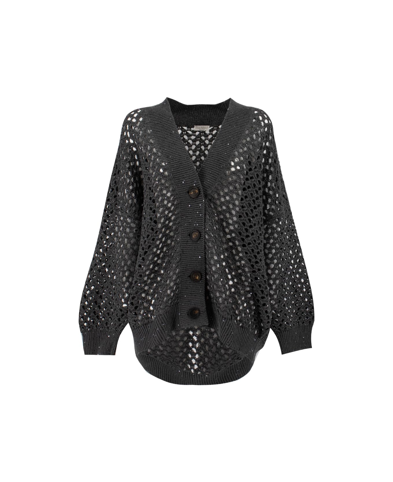 Cardigan made of Dazzling Net fabric that embodies the essence of summer knitwear, light and feminine with a shiny touch given by the sequins, button fastening, V-neck, comfort fit. Composition: 46% CO, 40% LI, 14% SE