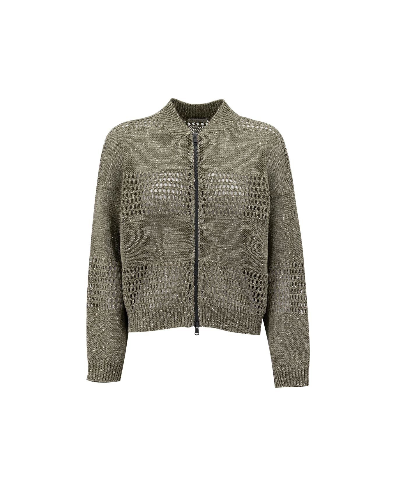 Sophisticated workmanship and distinctly feminine details characterise the new linen cardigan. The small sequins encased in the thread convey delicate luminous reflections along the entire surface, giving the cardigan a very refined look, double-slider zip fastening, regular fit.