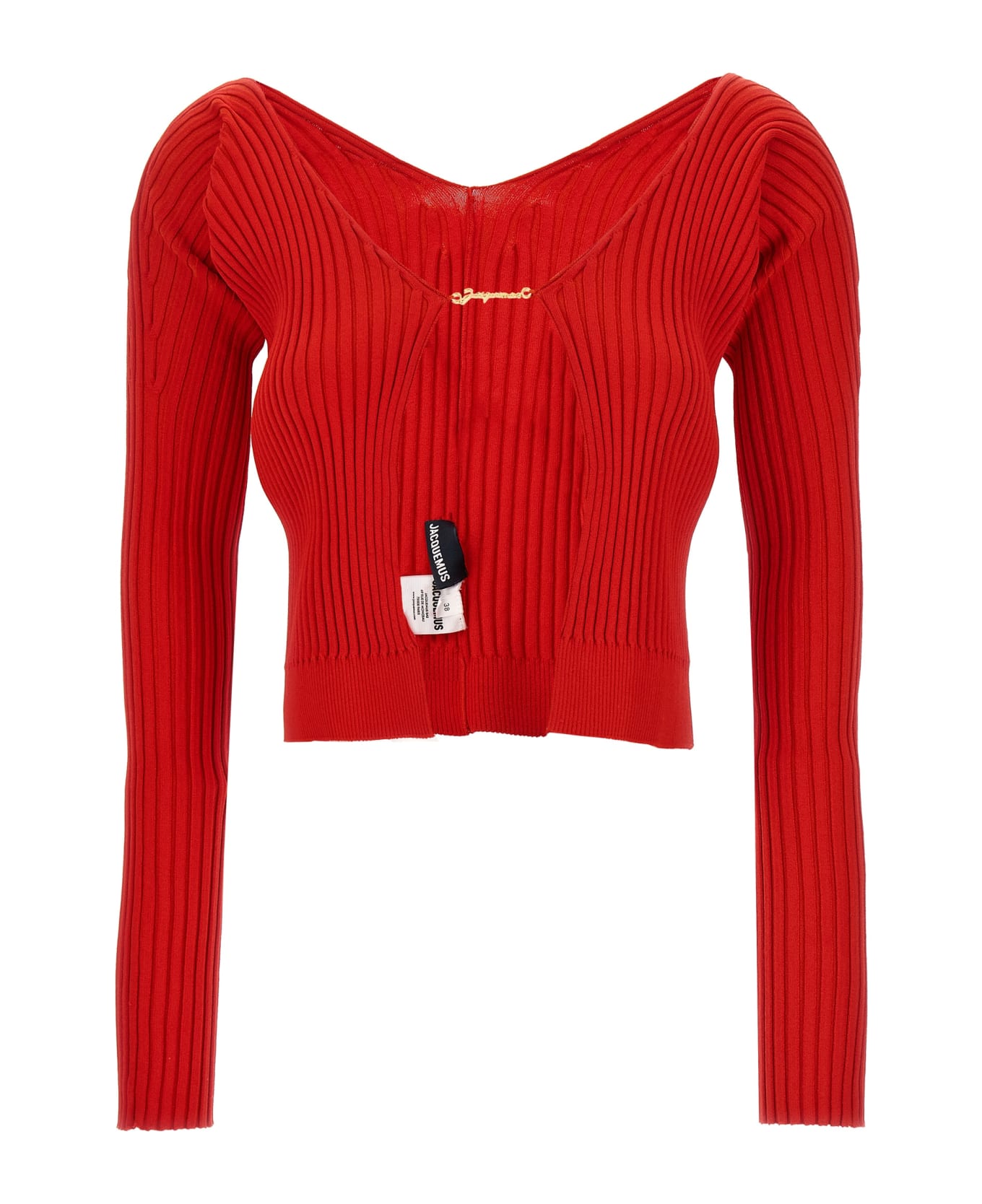 'La maille pralu longue' ribbed stretch viscose cardigan with maxi V-neck and front opening, and metal logo detail as closure. Composition: