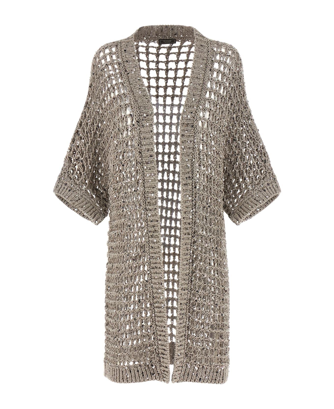 Mesh knit cotton knit cardigan with all-over sequin appliqué, dressing gown style, wide short sleeves with cuffs. Composition: 100% cotton