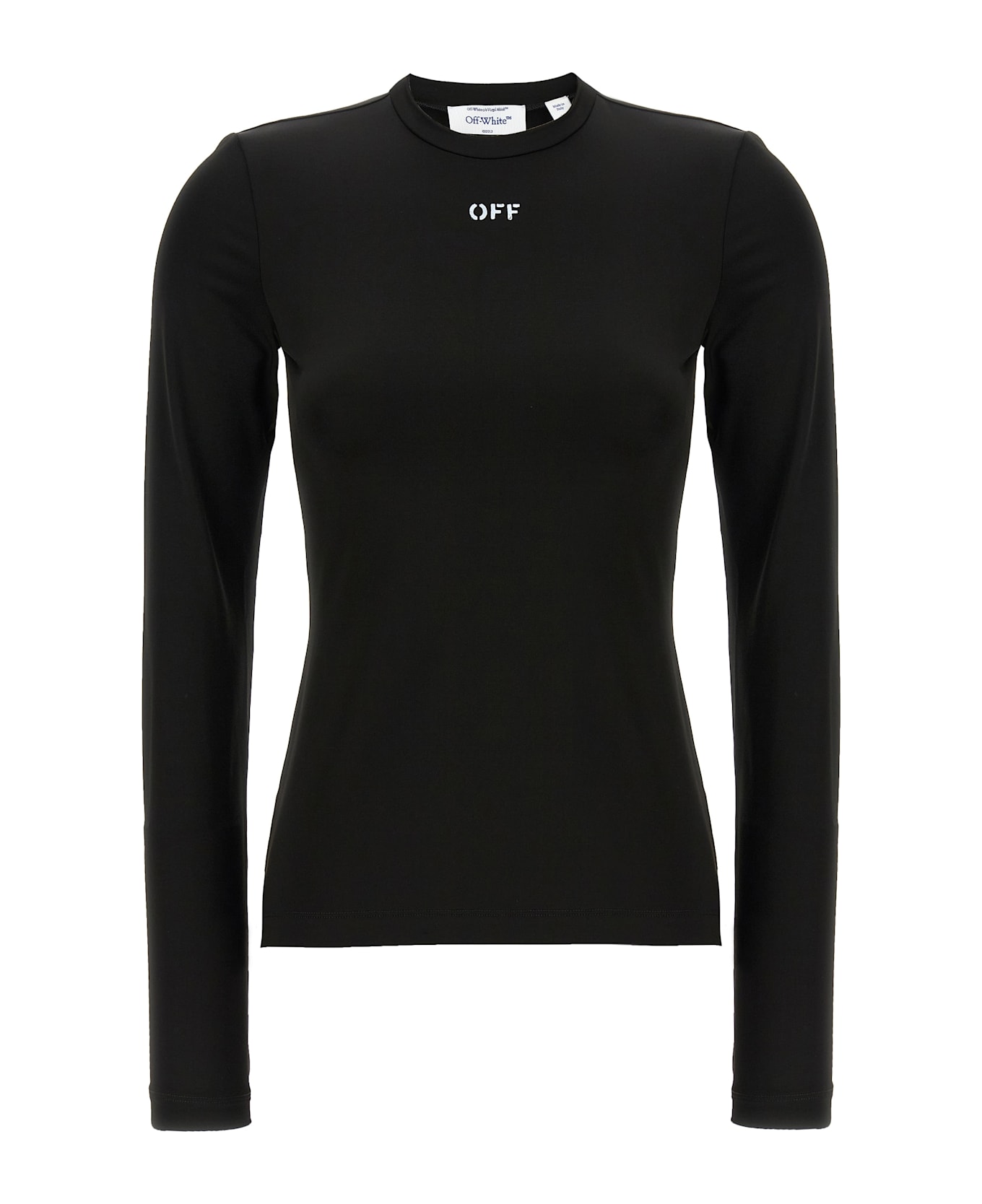 'Second Skin' style stretch tech fabric sweater with front 'Off Stamp' print, crew neck and long sleeves.