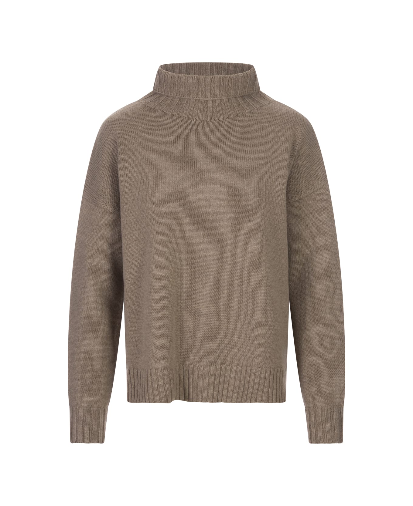 Gianna boxy-fit turtleneck pullover by Max Mara in dark beige wool and cashmere blend yarn. This model features a high collar, long sleeves, ribbed hems and a longer straight back with side slits.