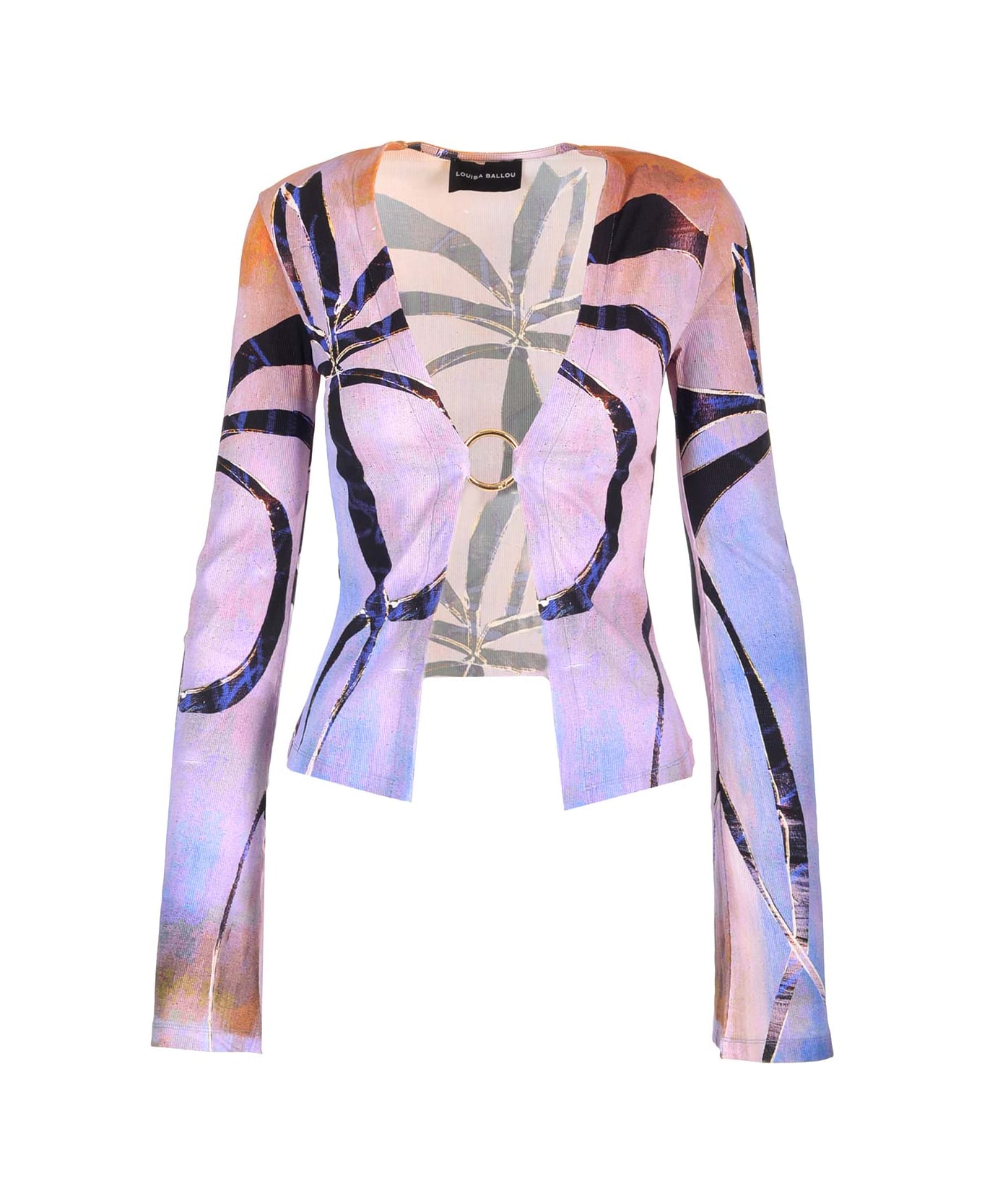 Patterned "Enigma" ribbed cardigan from Louisa Ballou in stretch cotton, long sleeves, golden O-ring closure.