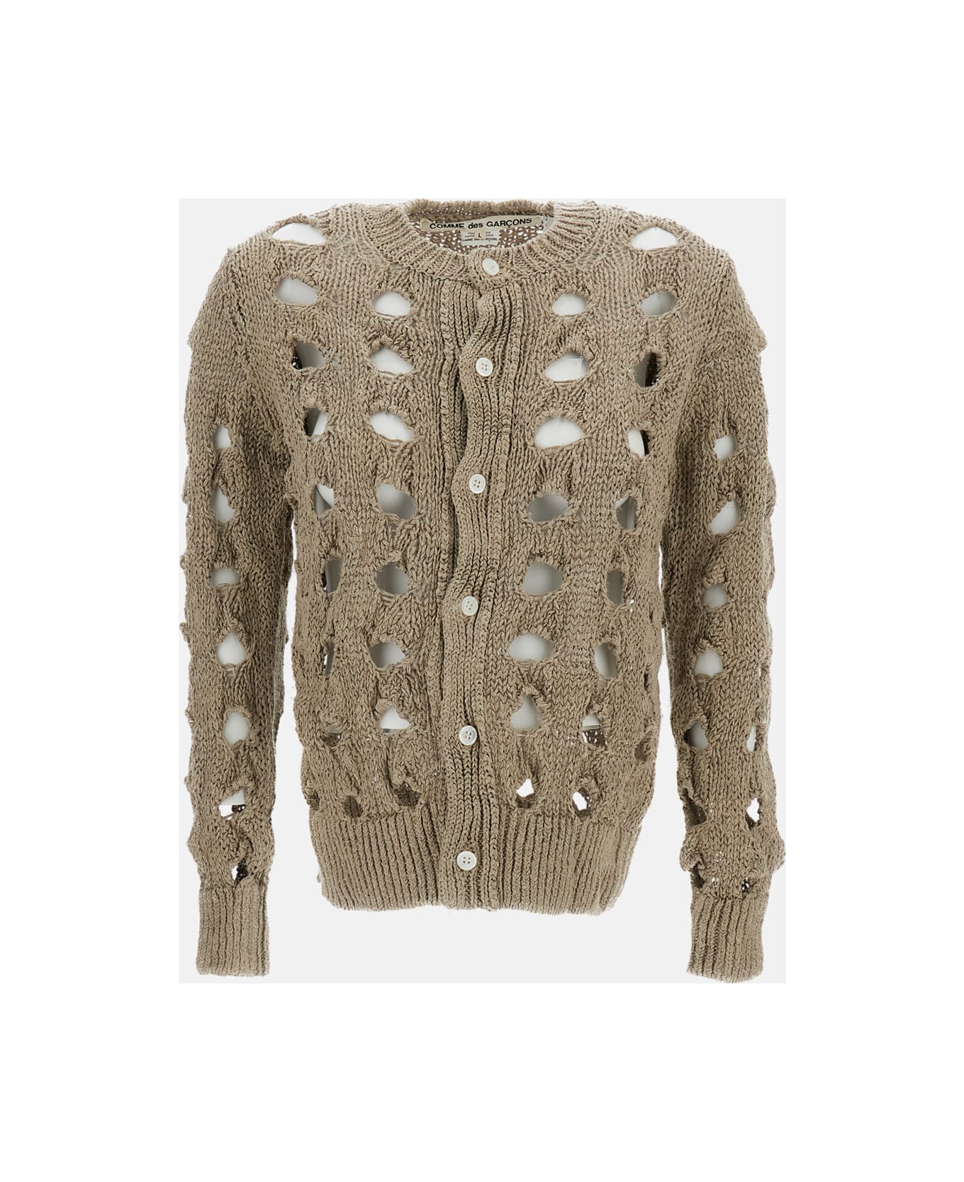 Perforated hemp cardigan Crew neck Long sleeves Full central button closure Ribbed trim on collar, hem, and cuffs Color: beige Composition: 100% Ca