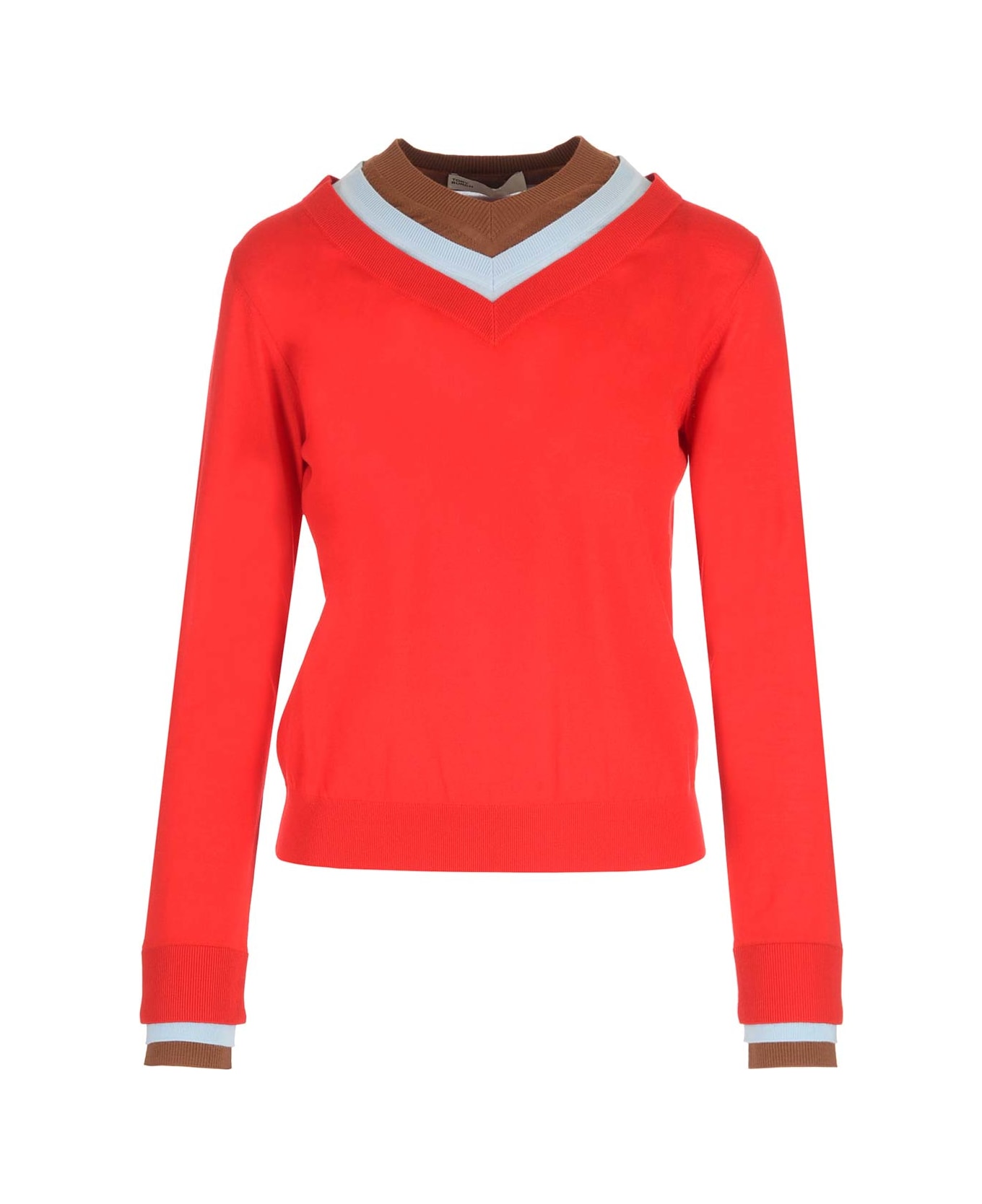 Triple color-block sweater from Tory Burch in wool, three overlapping V-neck sweaters (brown, light blue, red) without creating excessive volumes.