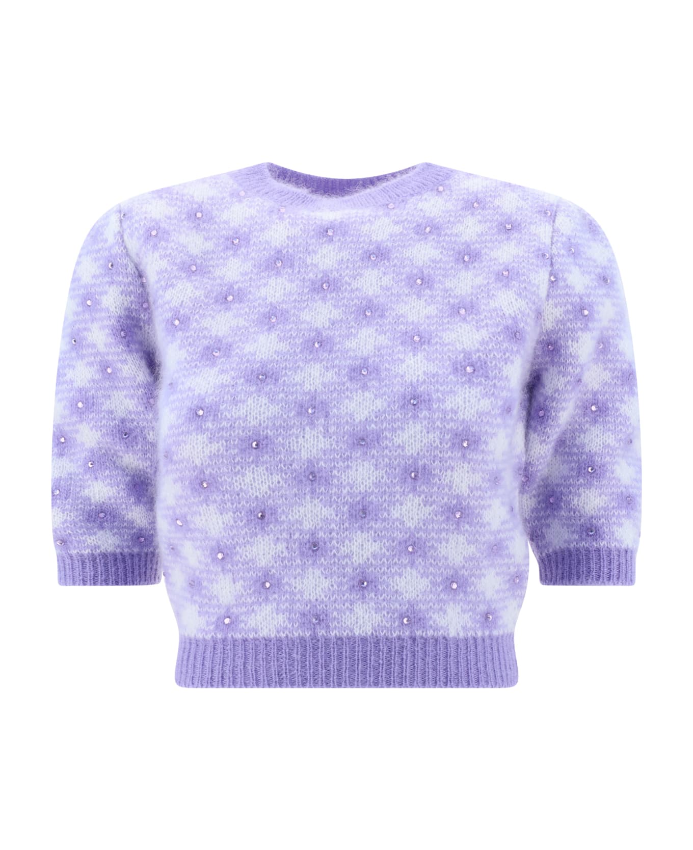 Mohair vichy sweater by alessandra rich, crop model, ribbed crew neck, knit design, all-over appliqué shiny beads, ribbed three-quarter sleeve hem, two-tone plaid pattern, ribbed hem, regular fit.