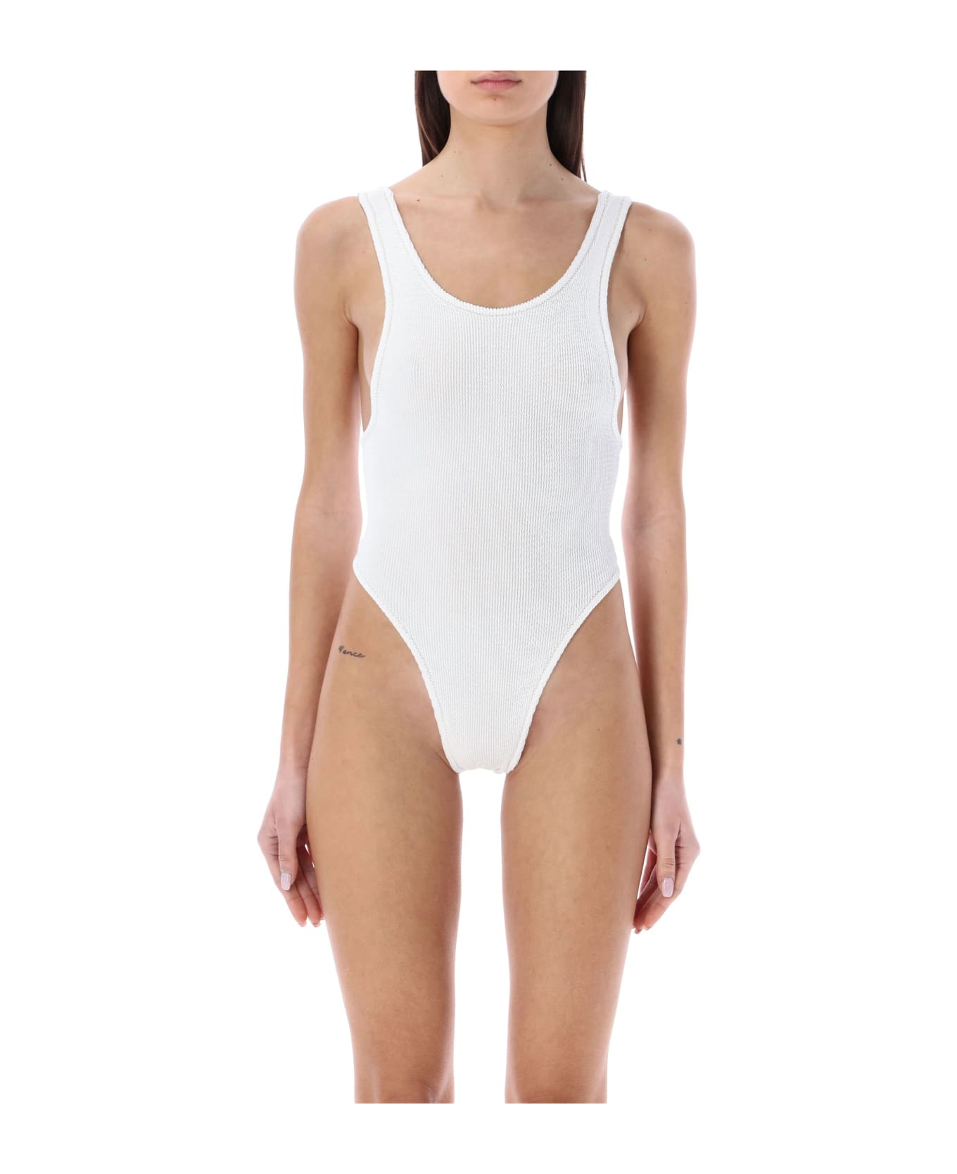 Ruby Scrunch Swimsuit By Reina Olga. Featuring: Scoop Neckline Signature Gold Stitching Fixed Straps U-shape Back Model Is 1,72 M