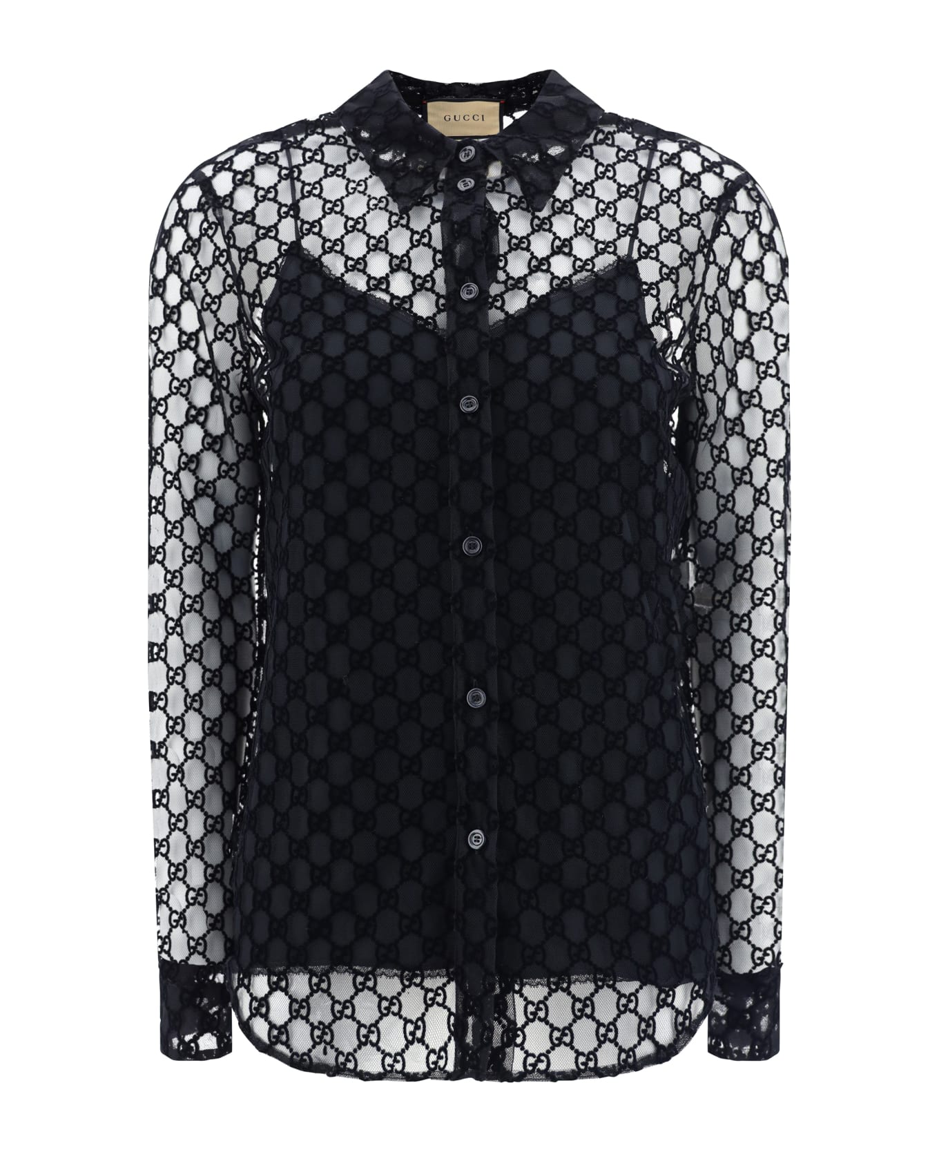 Shirt by gucci, transparent design with iconic gg logo contrasting across the surface, tank top with thin opaque straps applied under the shirt, front button closure, colassic collar. Composition: 100% % Polyamide