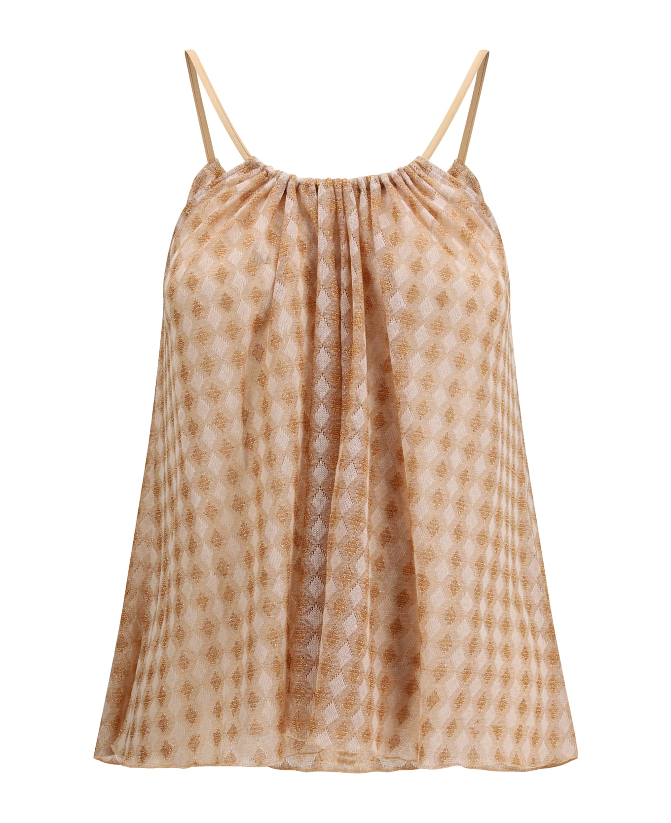 The diamond jersey top by forte forte plays with minimal shapes and a subtly shimmering finish. the slender shoulder strap supports soft gathers at the neckline, creating a fluid volume over the bust, while the geometric pattern comes alive through the woven lurex thread. a refined piece that blends light, texture, and understated femininity.