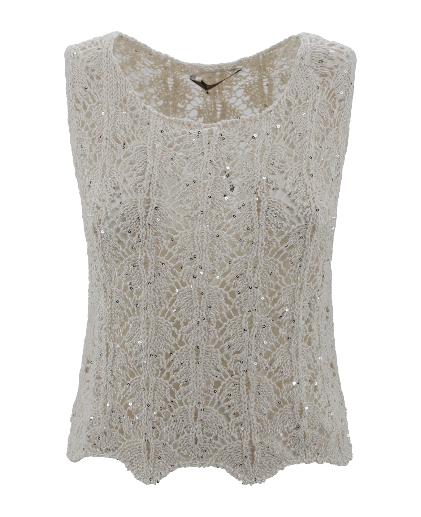 Cotton-blend lace top with lurex crystal sleeveless detailing with crew neck and flared hem.