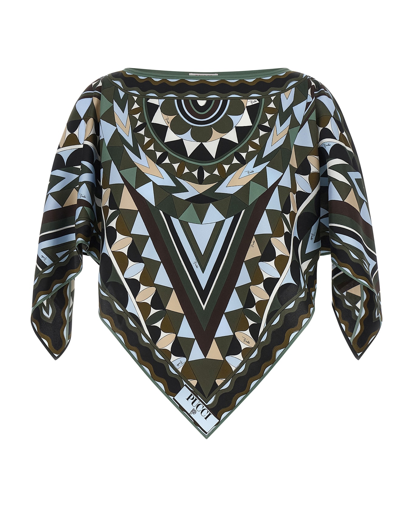 'Manuba' print silk twill top with cape silhouette, caftan pattern, boat neck, short asymmetrical sleeves, and asymmetrical hem. This product, like many other Pucci items, is made with an all-over print that falls differently on each garment The product shipped may differ from the one in the picture.