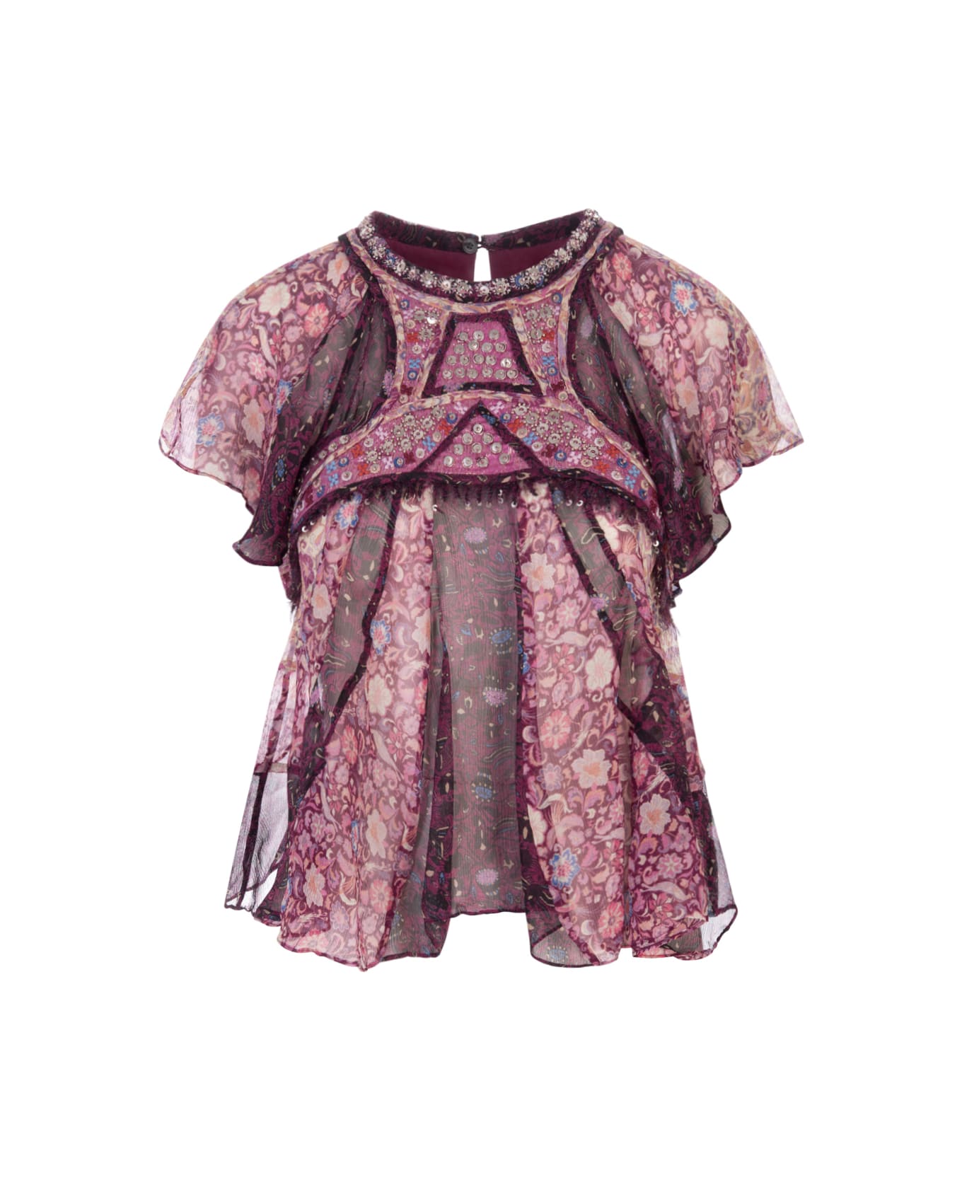 Orna top by Isabel Marant made from fuchsia patchwork silk chiffon featuring short sleeves, embroidered motifs, a back opening and a back zip fastening. Composition: Composition:, 100% Silk.