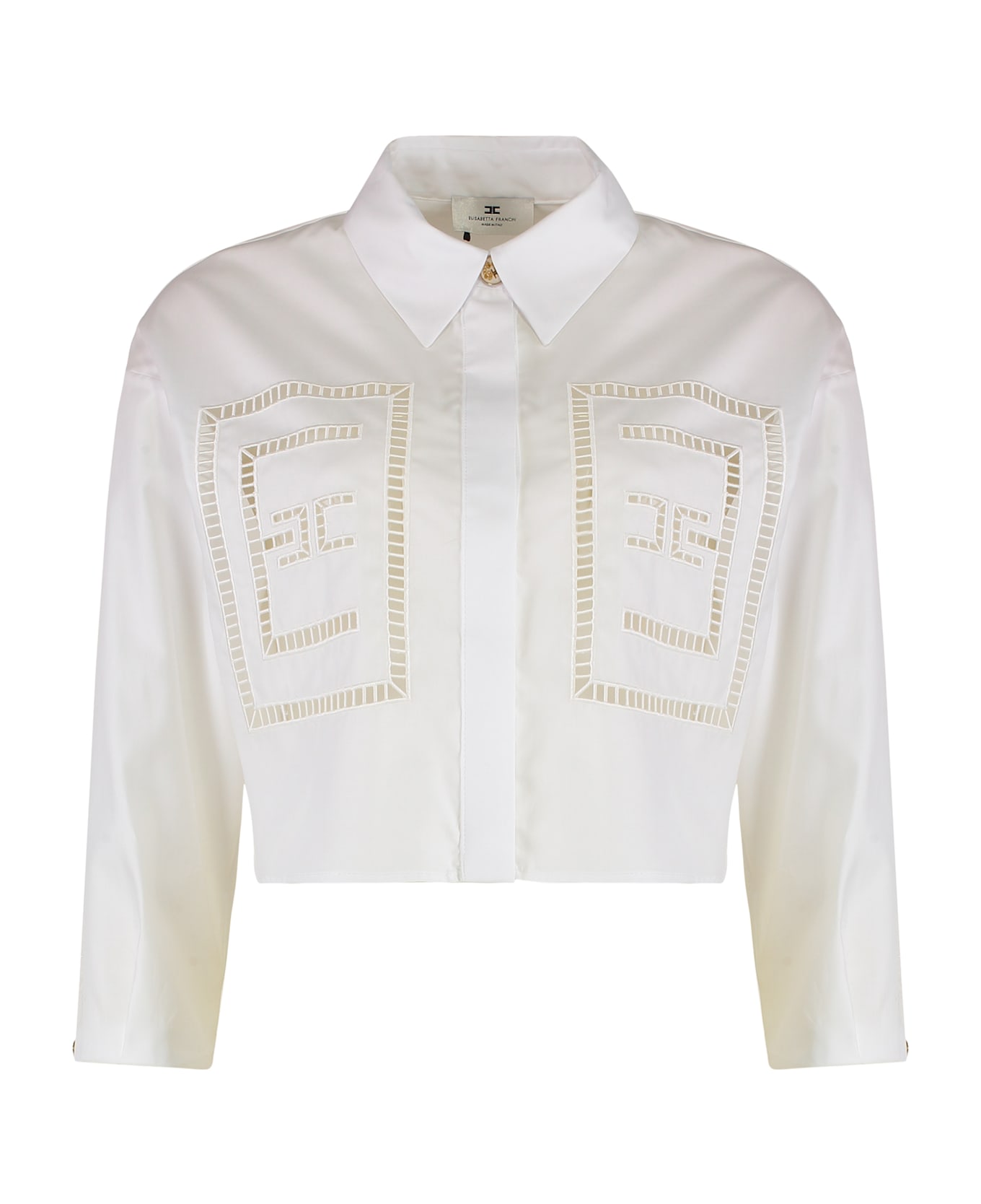 Present a wide collar and two logo embroideries on the chest. the closure is front with buttons.