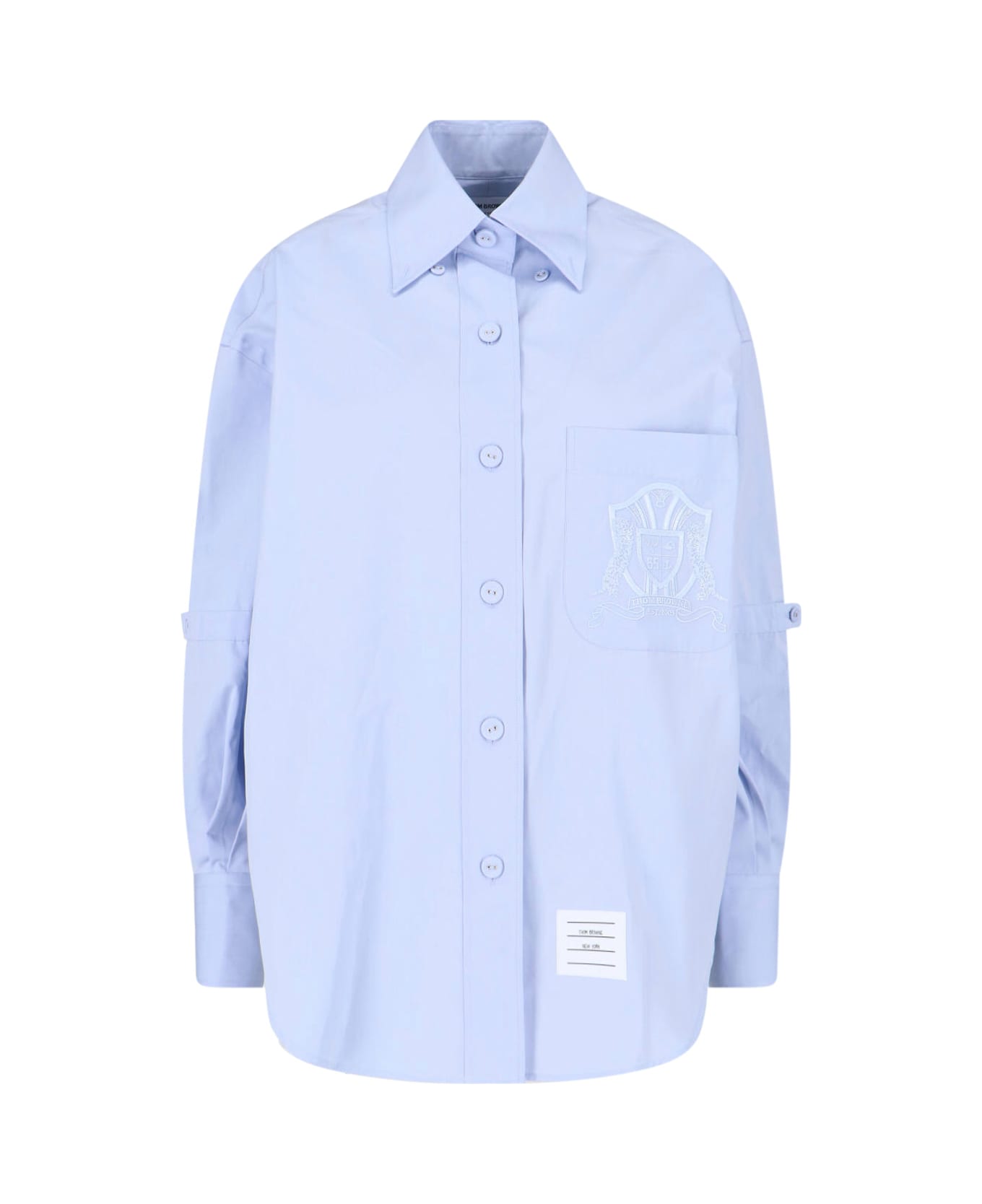Thom Browne poplin shirt, light blue, collar, button closure, long sleeves, one front pocket, logo tag on the front, front embroidery, curved hem. Composition: 100% Cotton