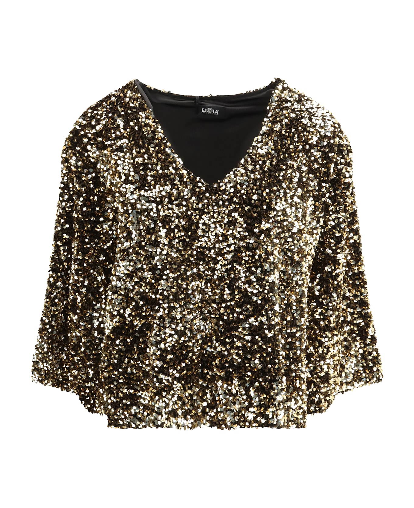 The sequined blouse by ella is an elegant and sparkling garment, perfect for adding a touch of luxury to your wardrobe. the v-neckline and wide 3/4 sleeves create a feminine and refined silhouette, while the a-line cut gives the model fluidity and movement. sequins cover the blouse, giving it a luminous and sophisticated effect, ideal for special evenings or elegant occasions.