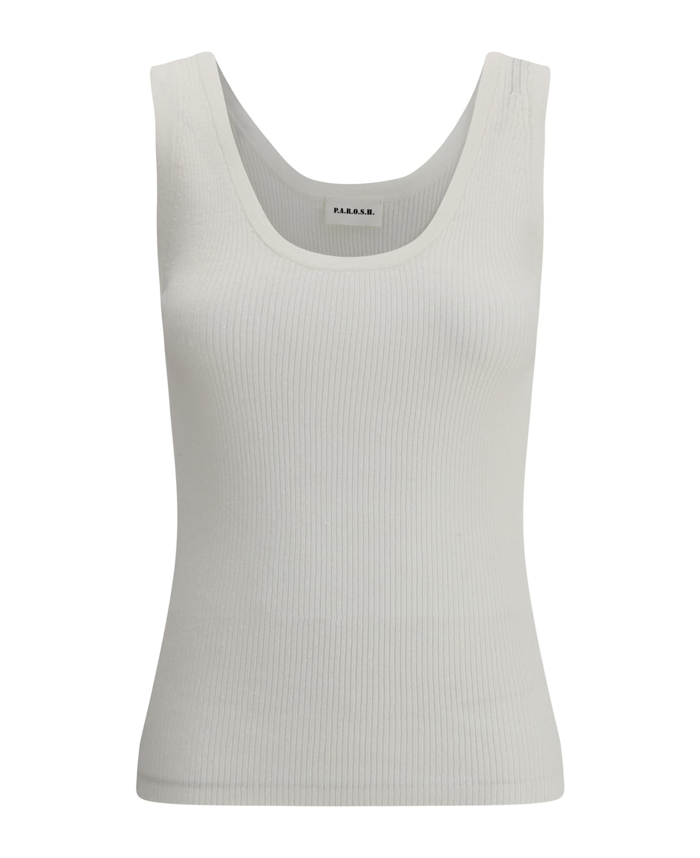 The ribbed tank top by p. a. r. o. s. h. is a simple yet elegant garment, perfect for a casual yet stylish look. the sleeveless design with thick straps offers comfort and an optimal fit, while the round neckline lends a delicate touch. the ribbed design adds texture to the garment, making it versatile and suitable for pairing with both casual pants and more elegant skirts.