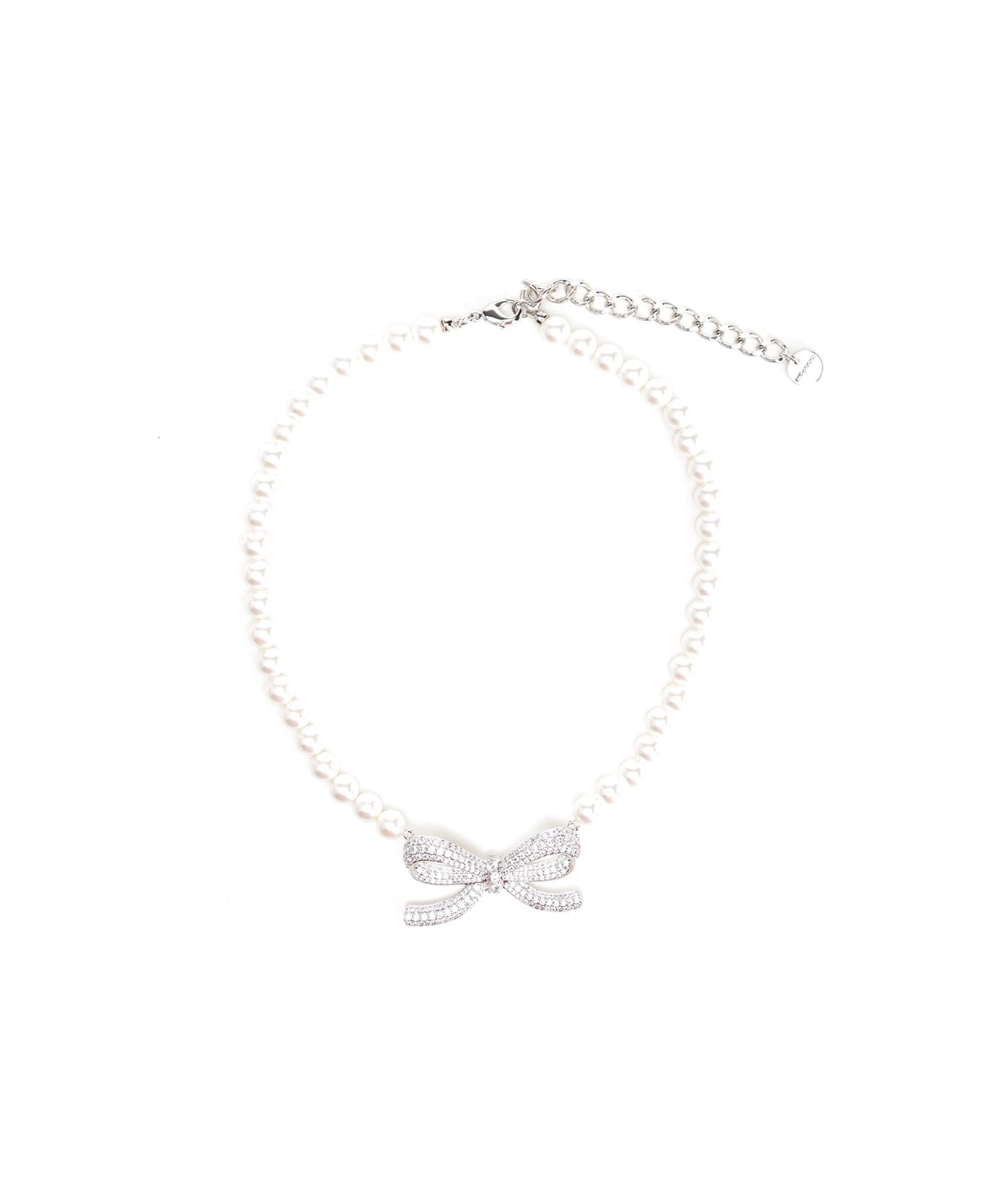Self-Portrait Pearl Bow Necklace in Silver Plated Brass with Faux Pearls and Crystals and Clasp Closure