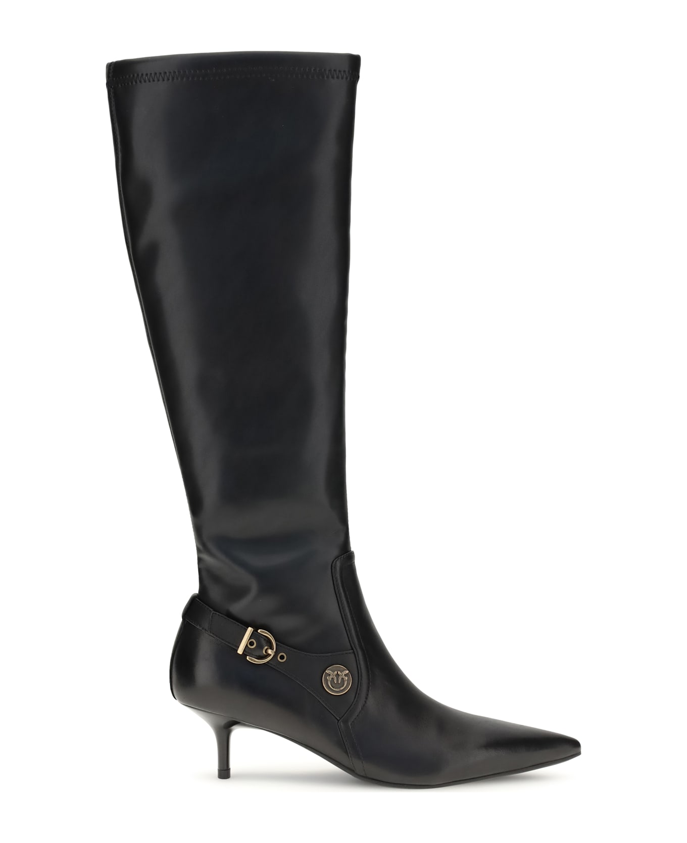 Pinko's knee-length boots are made of fine soft and smooth nappa leather, with leggings equipped with internal zippers for easy wearing and refined straps with metal loops. rounded toes and thin, high heels give these styles a feminine yet assertive look. leather lining, lightly padded leather insoles and soles made of tunit, a synthetic material that mimics the characteristics of leather, complete the shoes.