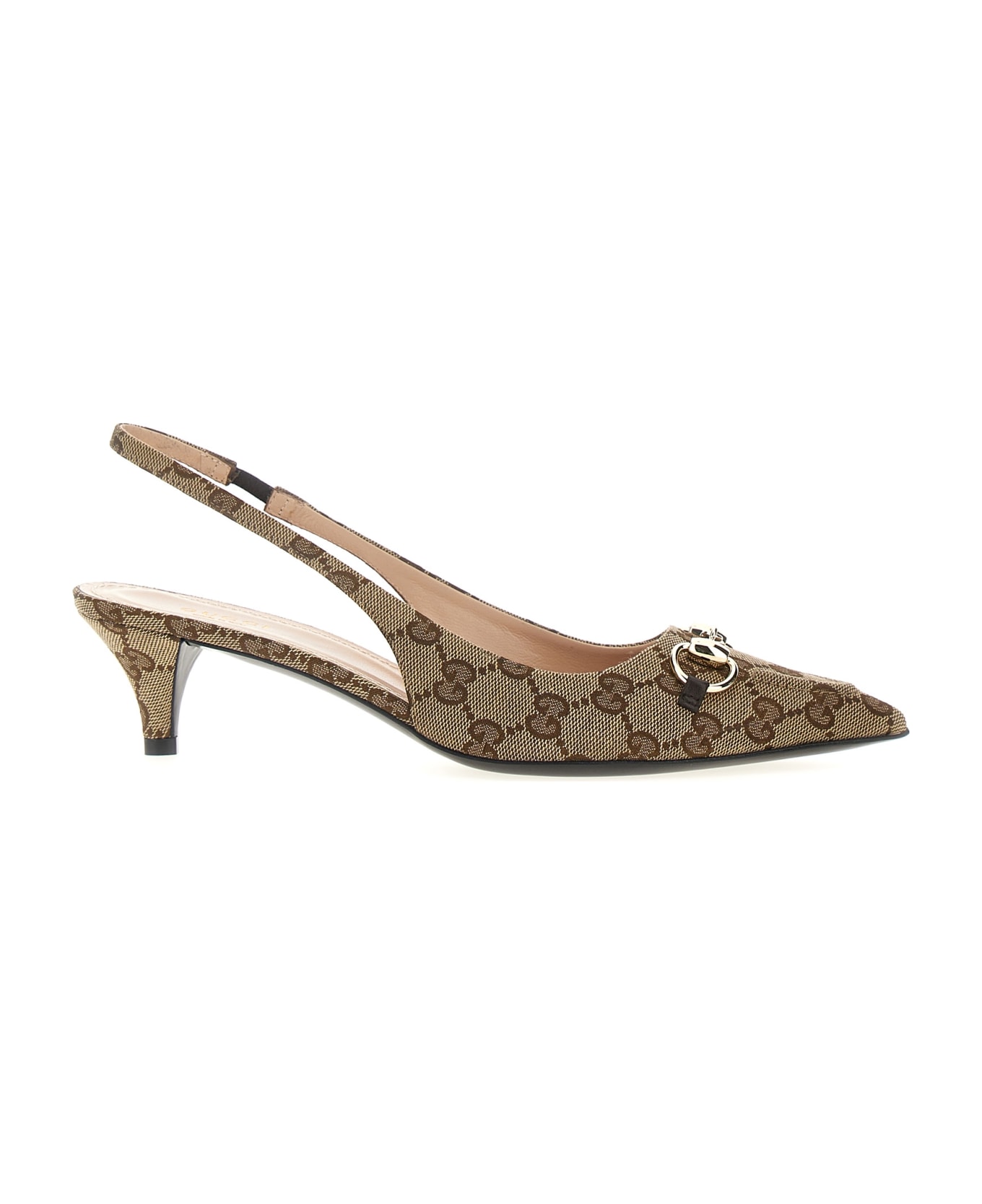 Original 'GG' fabric slingbacks, front clamp application, elastic strap, low heel. Composition: 65% polyester 18% cotton 17% polyamide