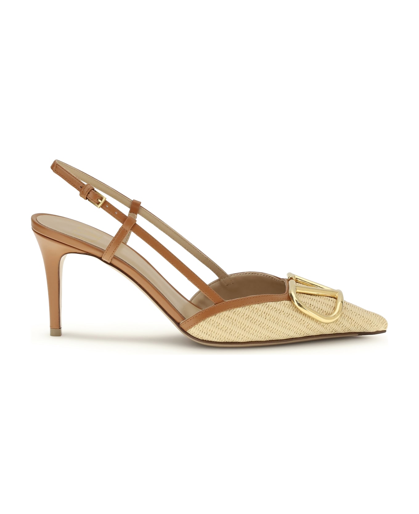 The vlogo signature raffia slingback pumps by valentino garavani are an elegant and modern interpretation of summer shoes. crafted from synthetic raffia with calfskin details, these pumps combine lightness and luxury. the distinctive vlogo signature accessory in an antique brass finish adds a touch of sophistication and originality. the slingback version provides ideal comfort, making them perfect for adding class and style to any summer or formal look.