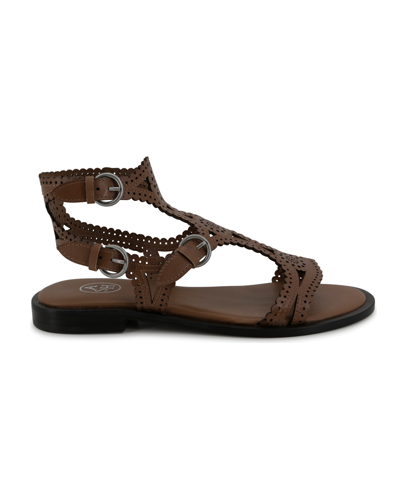 Paprika flat-soled sandals with side buckle closure, scalloped hem, flat sole.