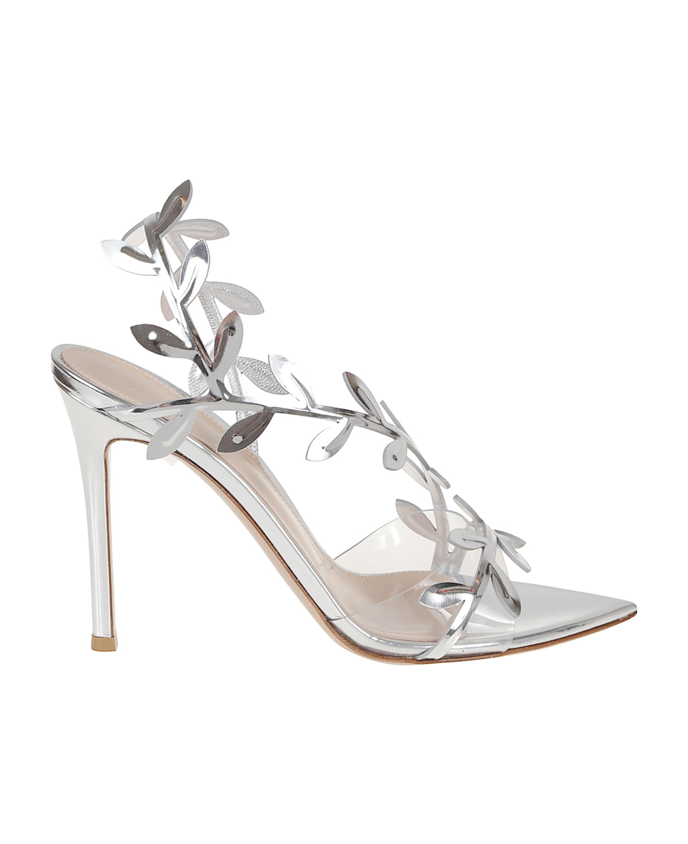 Flavia sandal made of mirrored leather by GIANVITO ROSSI. Pointed toe; stiletto heel (10. 5cm); asymmetrical design. Featuring a soft transparent Plexi insert on the front embellished with a laser-cut floral motif.
