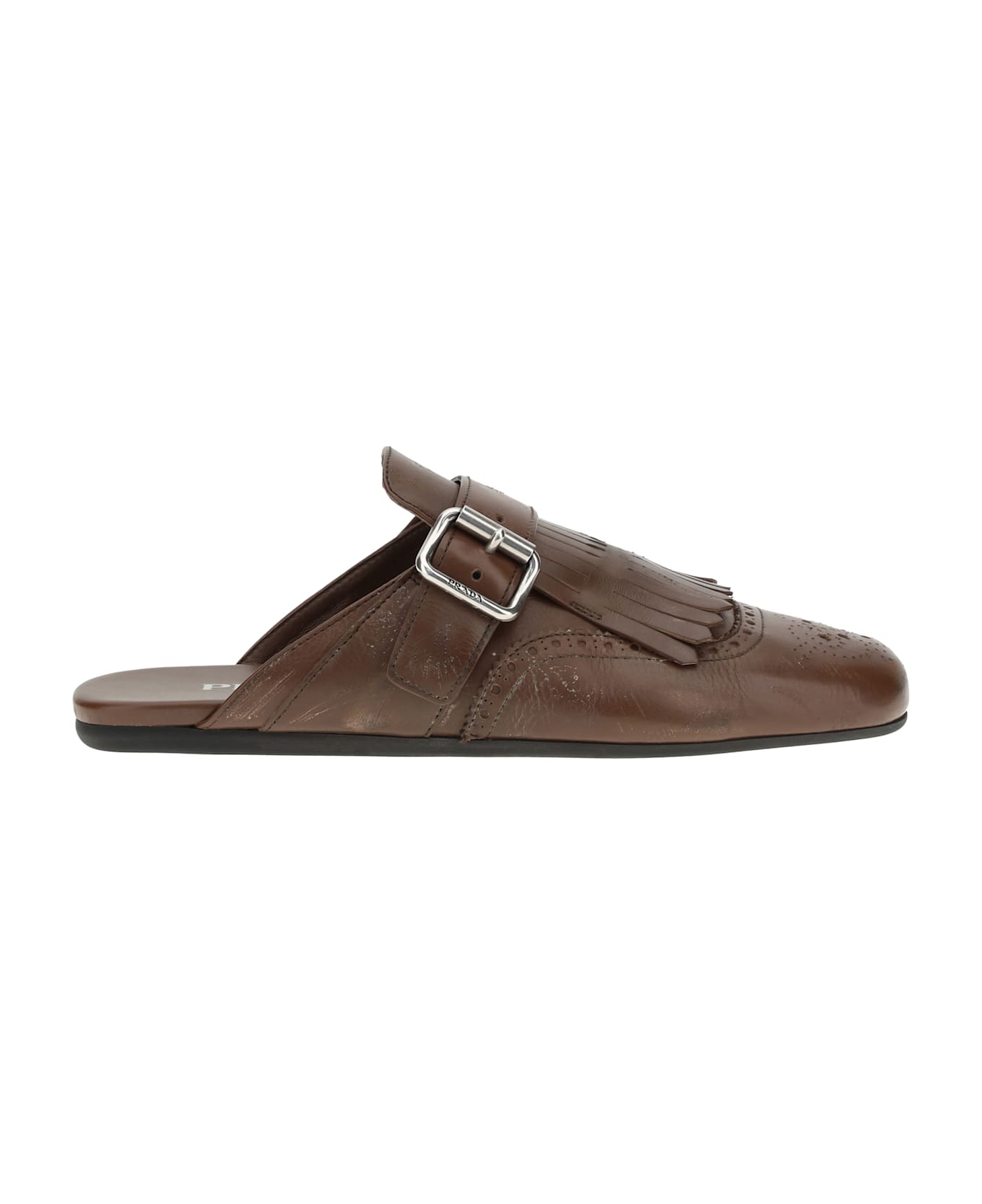 Prada's leather mules is an elegant and versatile slip-on design that provides practicality and comfort. the buckle closure adds sophisticated detail, while the multi-layered sole offers durability and a contemporary touch. complemented by a distinctive fringed detail, this sabot perfectly embodies prada's signature minimalist and chic aesthetic, perfect for those seeking sophisticated style without sacrificing functionality. Composition: 100% % Calf Leather Bos Taurus