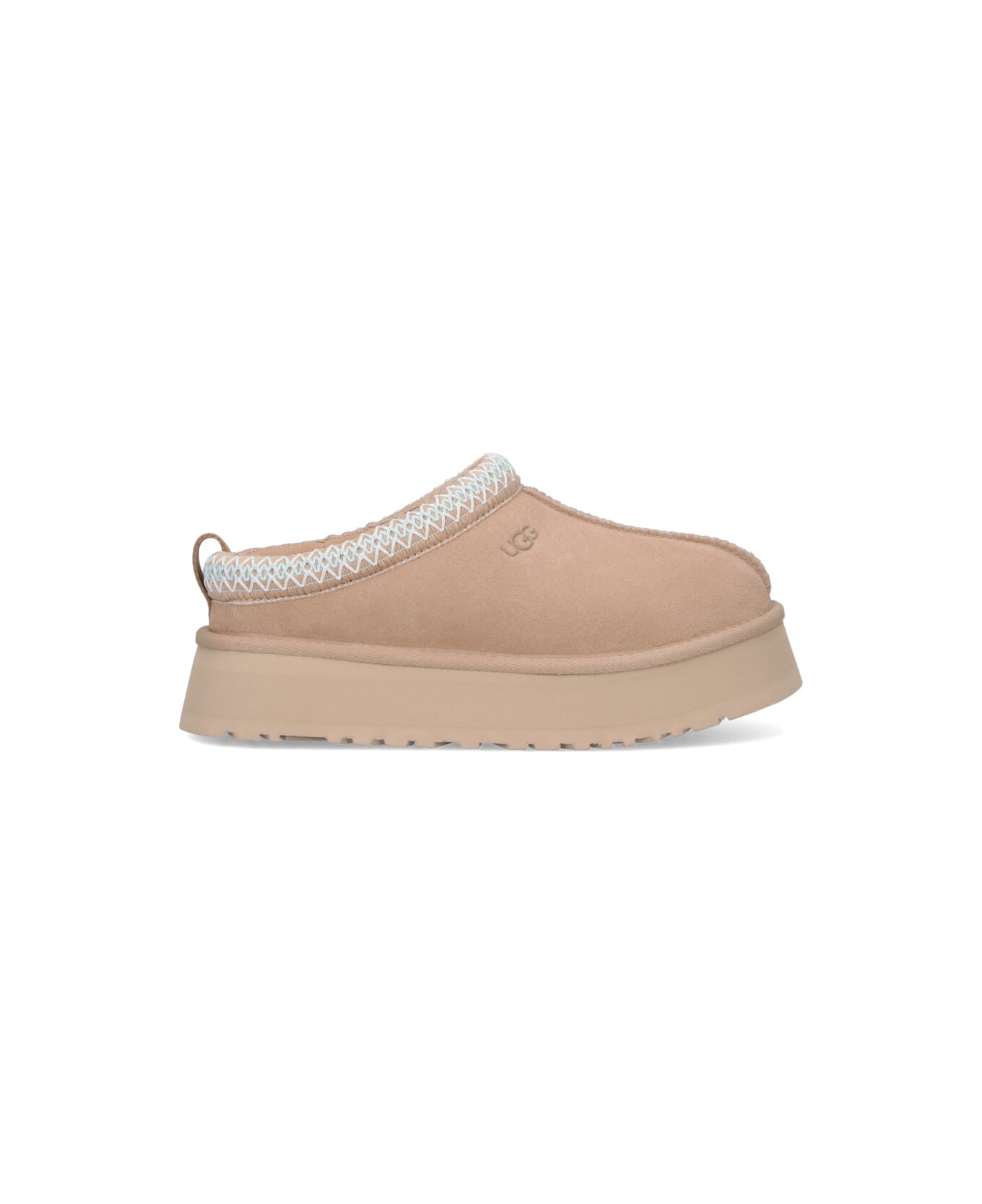 Mules "Tazz II" Ugg. Beige suede with round toe, side logo embroidery, white UGGbraid detail, red back tab, slip-on fit, white shearling lining, rubber platform sole.