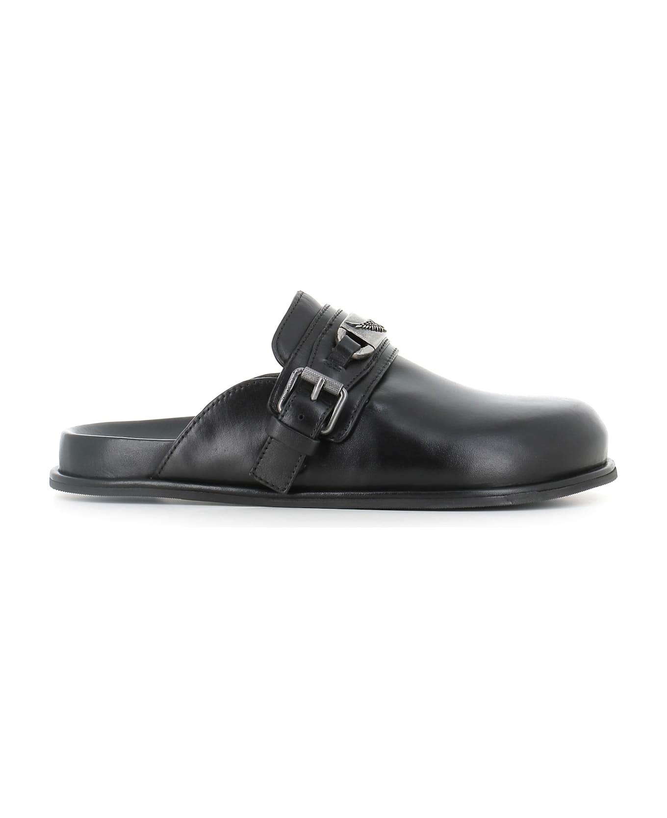 Black leather women's Sabot by Zadig & Voltaire, featuring by Silver plate with wings logo and a decorative buckle. Rubber sole. Lined interior. Heel: 3 cm