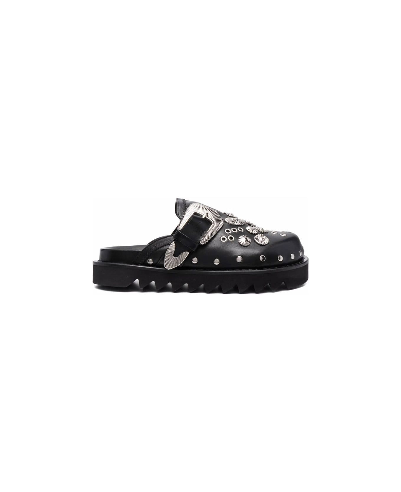 black leather round toe slip-on style branded insole decorative buckle detailing ridged rubber sole silver-tone hardware