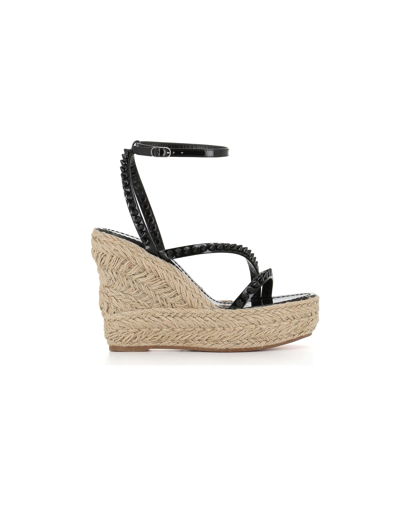 Black leather Wedge Christian Louboutin, featuring an open toe, tone-on-tone studs and ankle strap. Cord fund with rubber sole. Heel: 12 cm