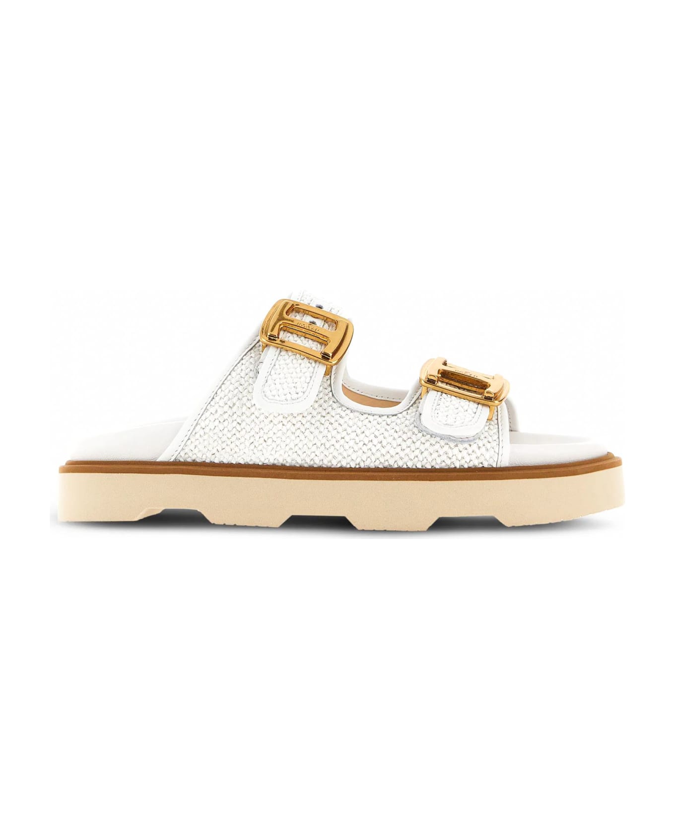 White H620 sandal Raffia upper Smooth leather trim Adjustable straps with metal H buckles Leather fussbett Leather welt EVA sole