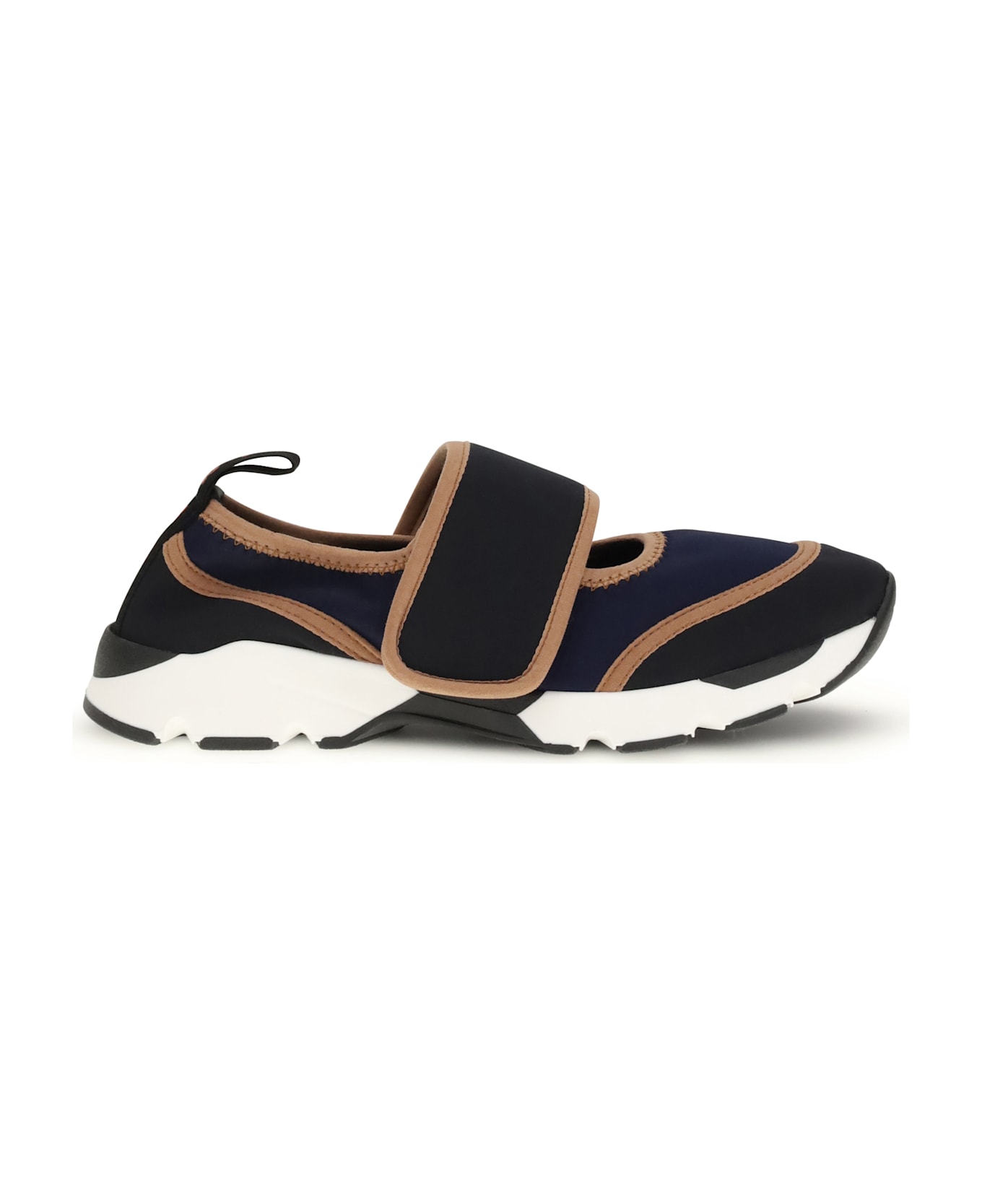 The running mary-jane sneakers by marni reinterpret the classic ballerina style with a sporty twist. the two-tone design with contrasting piping and deconstructed slip-on construction ensure comfort and style, while the wide velcro closure ensures practicality. the model is completed with a logo pull-tab on the heel and a soft rubber sole for a light and dynamic gait. Composition: 80% % Polyamide, 20% % Elastane