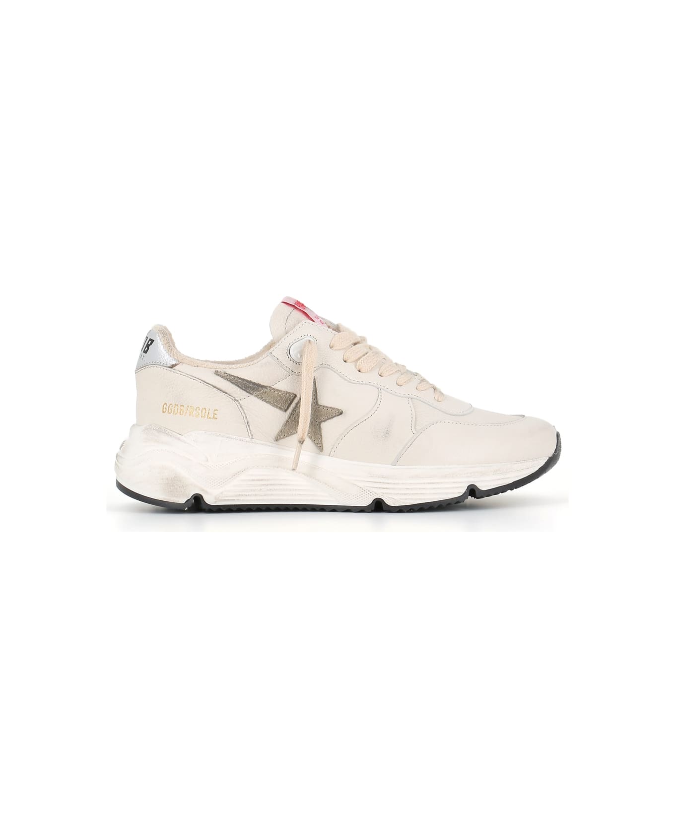 White leather Sneaker from Golden Goose, featuring by a visually appealing, from the RUNNING logo on the tab and gives an internal soletta of 2 cm. Gray suede star and silver heel tab. Rubber sole. Heel: 3 cm Composition: Leather