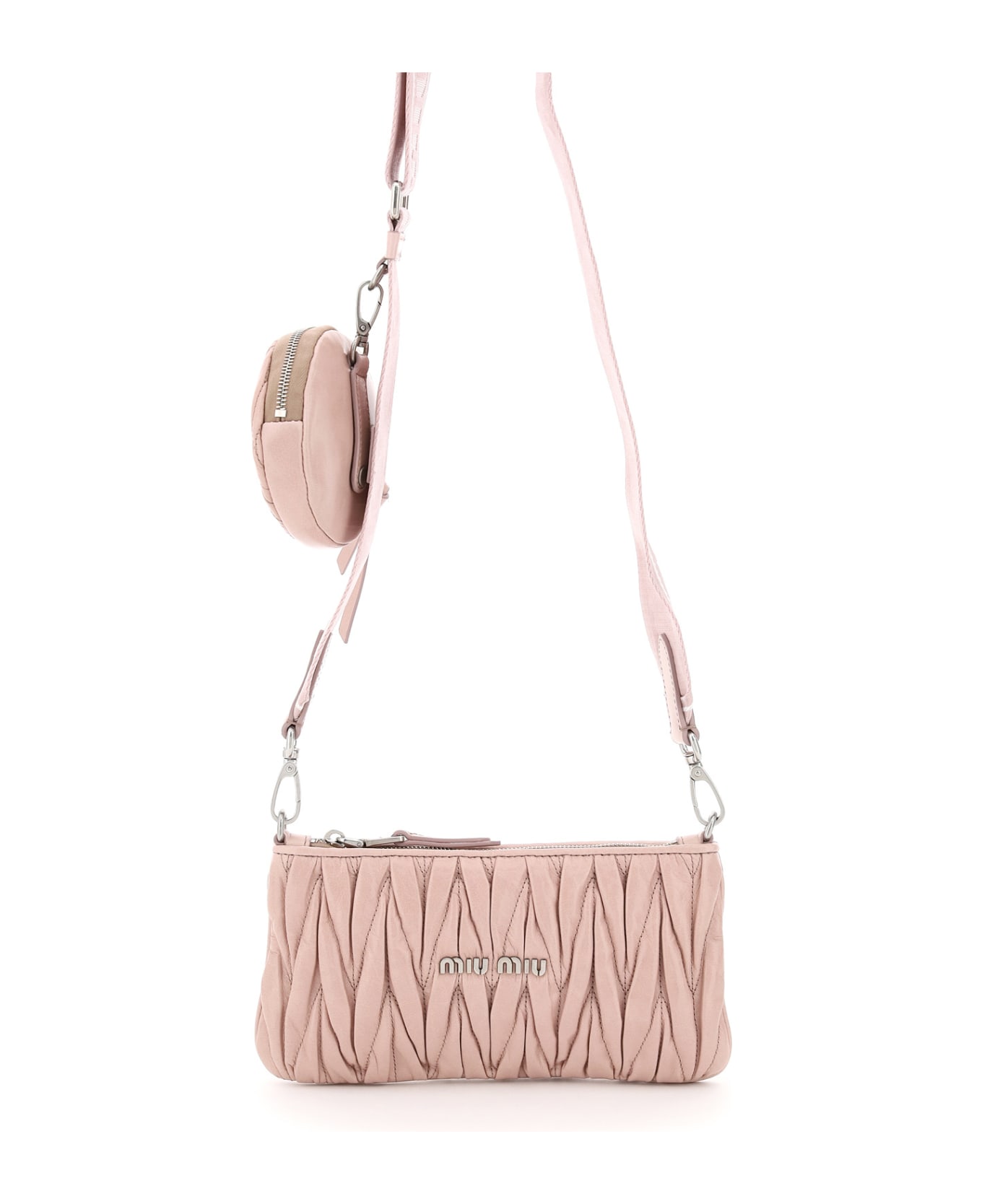 Miu Miu mini bag in quilted embossed nappa, enriched by a fabric shoulder strap with jacquard logo over the whole length, equipped with a removable zip pouch in branded leather with snap hook and back loop with snap button. Zip closure, metal logo applied on the front, satin-lined interior with a flat pocket. Steel-finish metalware.
