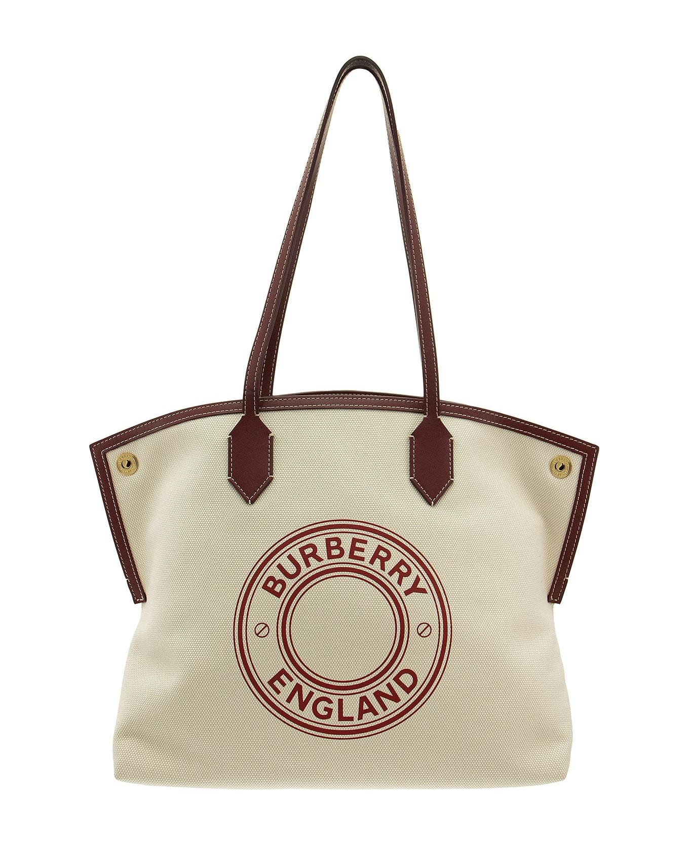 A versatile cotton-canvas tote bag accented with topstitched leather and a printed logo graphic. The relaxed style fastens with unique press studs that release from the inside to keep valuables secure. Carry in hand or on the shoulder. Two interior slip pockets Open top with press-stud closure Hand-painted edges Polished metal hardware 8037378 A1395 MEDIUM LOGO GRAPHIC COTTON CANVAS SOCIETY TOTE NATURAL/GARNET Composition: Outer: 100% cotton Trim: 100% leather Linings: 55% cotton, 45% linen; faux leather (55% polyurethane, 45% polyester)