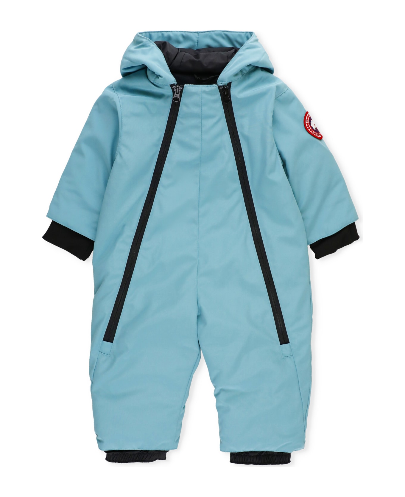 - Light blue Canada Goose Kids feather suit for boy - Hood - Front double-slider zip fastening - Elastic trims - Contrasting colour and fabric logoed patch Composition: 84% Polyester, 16% Cotton Lining:, 100% Polyamide Padding:, 80% Duck Down, 20% Down Feather