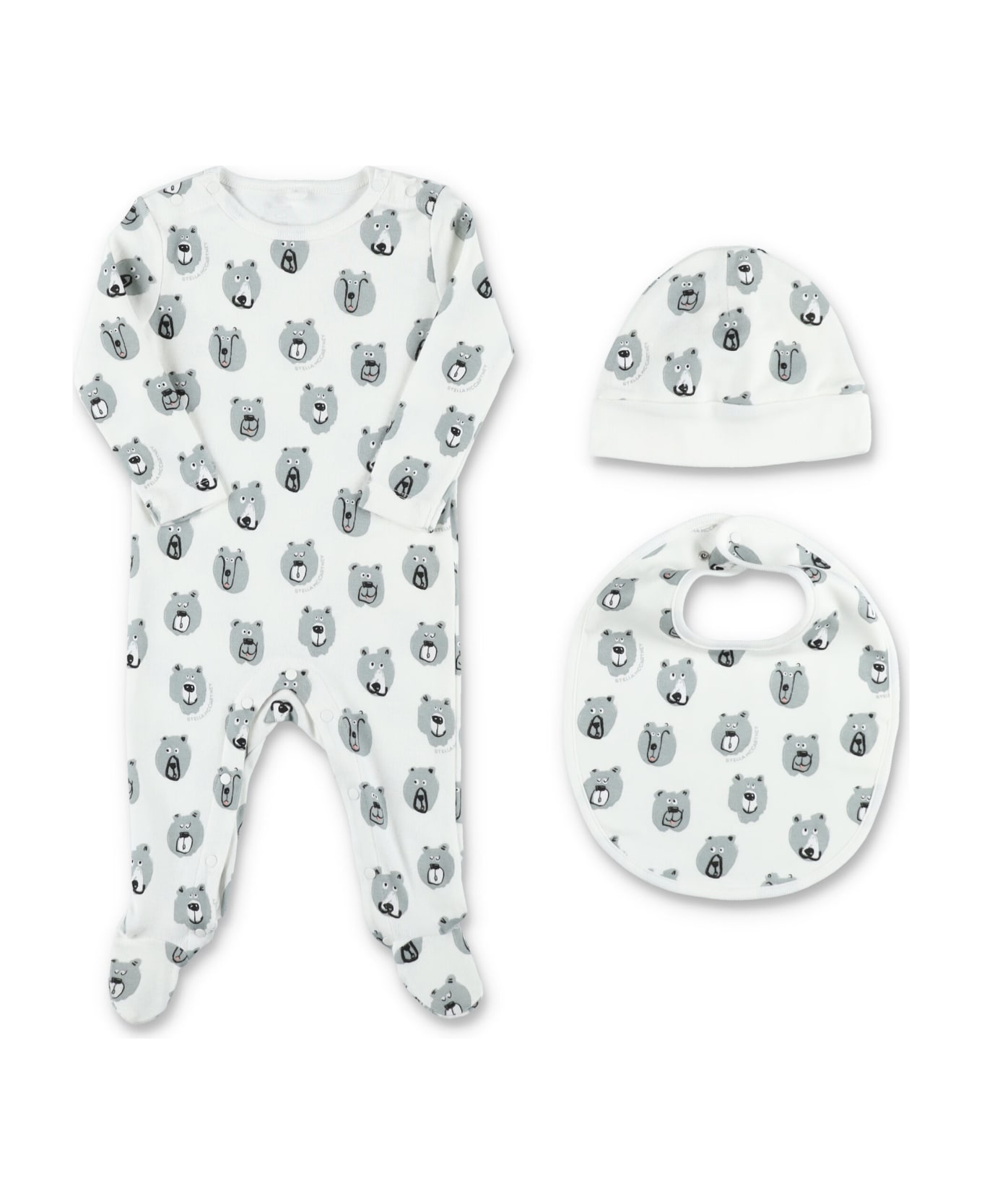 Baby Set Composed By Jumpsuit, Bib And Cap By Stella Mccartney Kids. Featuring: 1) Jumpsuit: Crewneck Button Fastening On Side Collar And Bottom Long Sleeves Teddy Bear All-around Print 2) Cotton Bib Back Snap Button Fastening Teddy Bear All-around Print 3) Cotton Baby Cap Upturned Hem Teddy Bear All-around Print