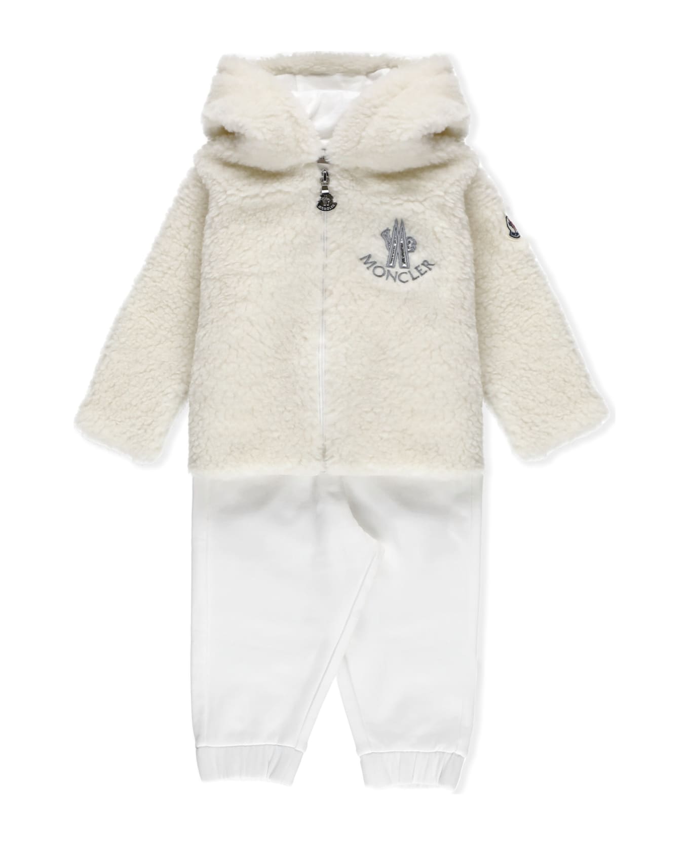 - White Moncler Baby two-piece set for boy - Hoodie - Long sleeves with loged patch at left sleeve - Front zip fastening - Front contrasting colour embroidered logo - Pants with elastic at hem - Elastic waist - Rear tone on tone loged label