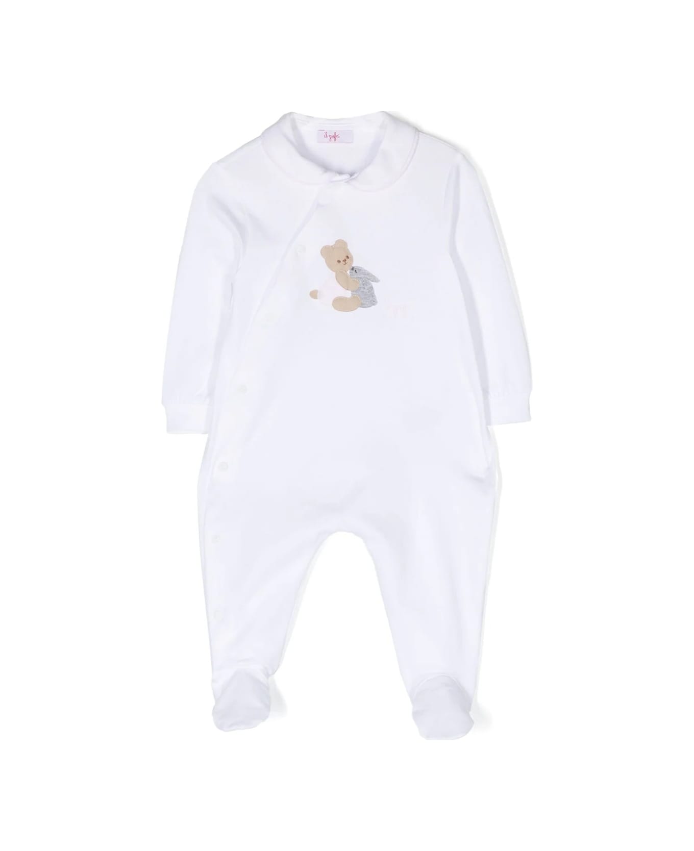 Sleepsuit with feet Il Gufo made of white stretch cotton jersey with round collar trimmed in pink and white striped poplin. The garment features a frontal application of a cute teddy bear in shades of beige, with pink striped detail, embracing a small rabbit with grey windowpane fabric details. It has a practical closure with a row of asymmetric logoed buttons down the front and features an embroidered logo in pink.