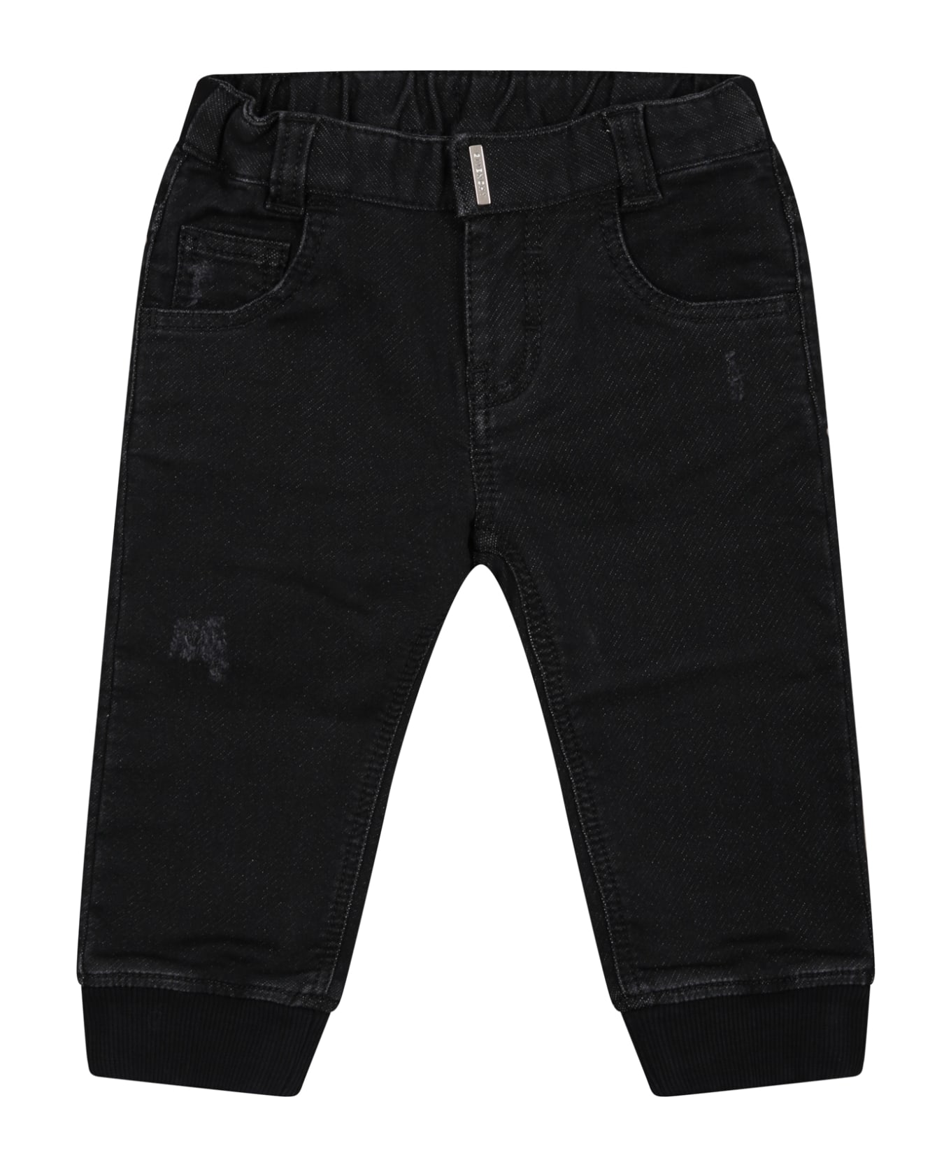 Color: Black Black jeans, five pockets, with belt loops, adjustable elastic waistband, zip fastening and logoed botton. They are embellished with logo and monogram on the back. 64% Cotton. 32% Polyester. 4% Elastane. Machine wash at 30°C.