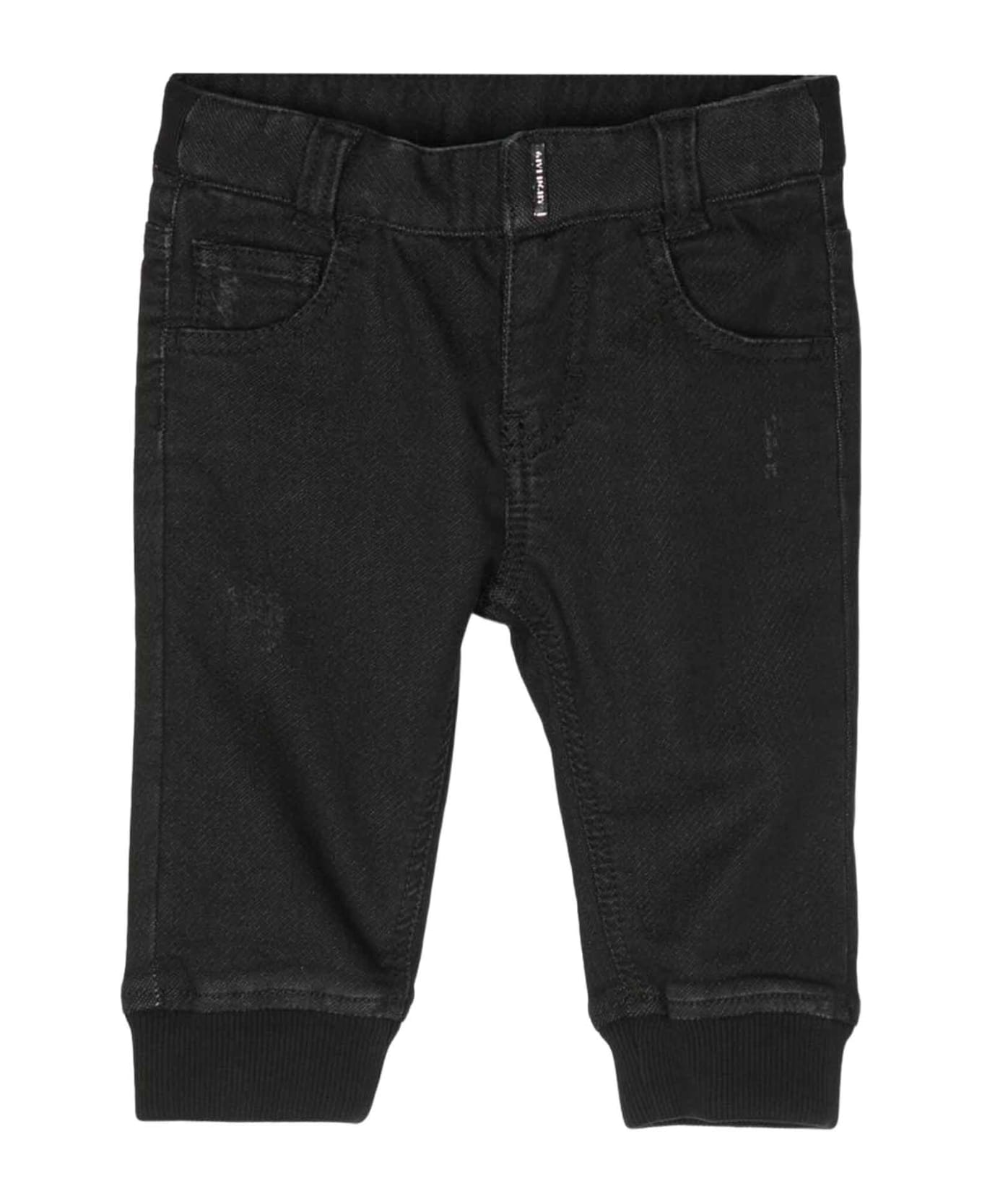 black trousers baby boy. Logo print o rear, ripped details, belt loops, elasticated ankle cuffs and classic five pocket design. Cotton 64%, Polyester 32%, Spandex/Elastane 4%