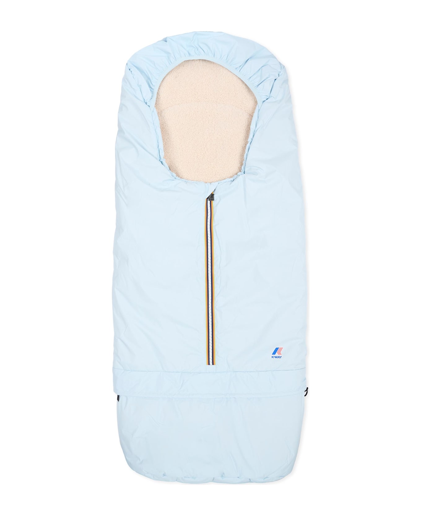 Light blue sleeping bag with shearling lining, front zip closure, hood, back loops for stroller straps, and a removable zipped bottom. It is decorated with logo on the front.
