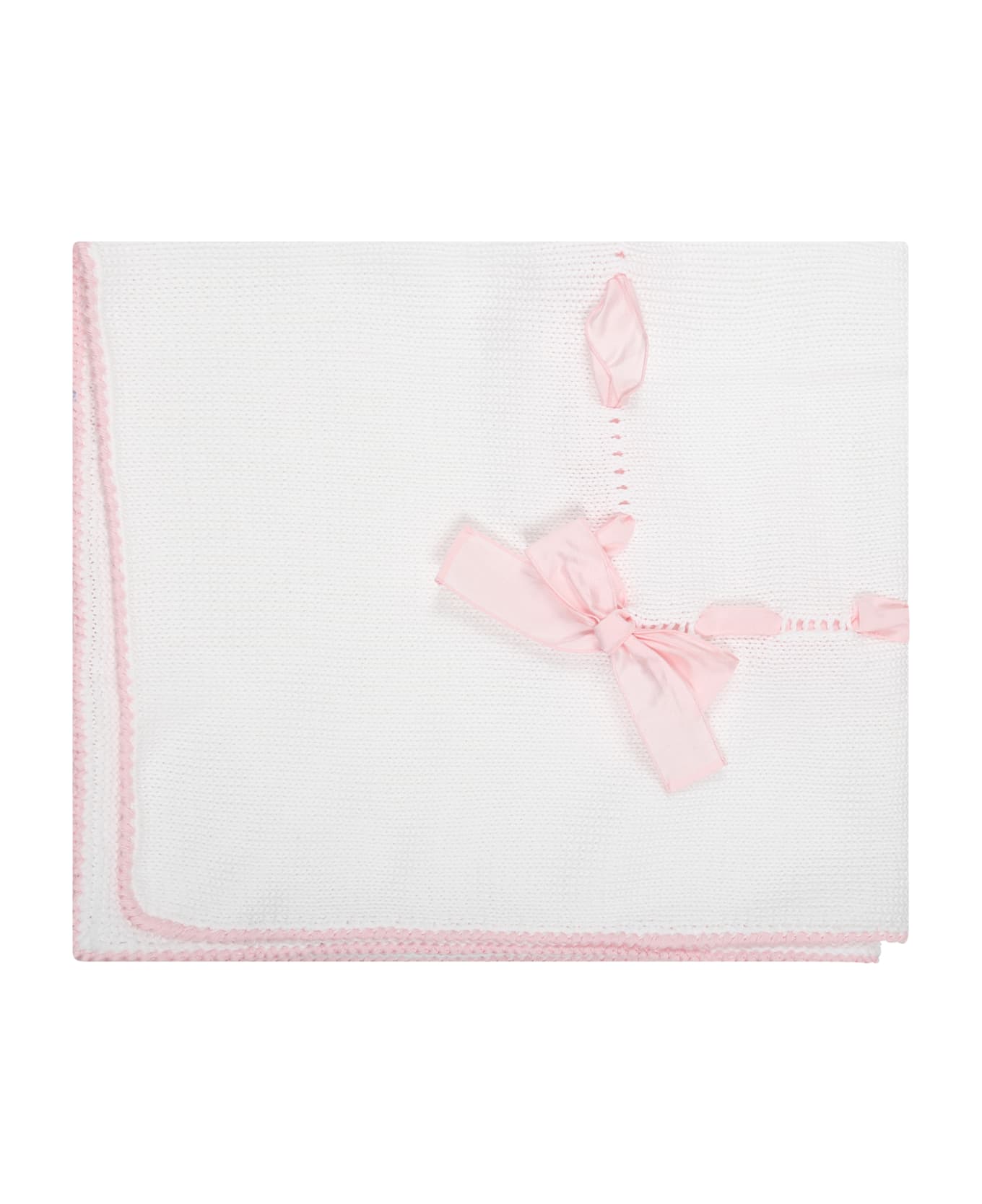 White blanket, in cotton, with contrasting pink hem. It is embellished with a pink ribbon and bow.