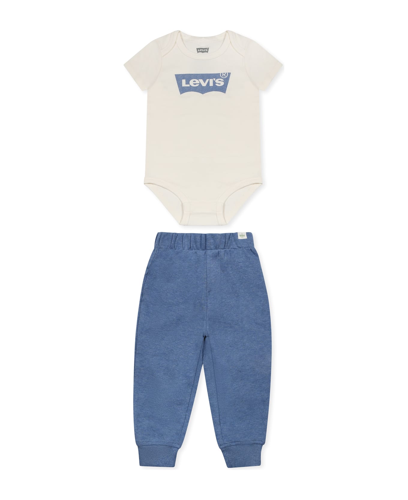 Blue organic cotton suit, composed of bodysuit and trousers. White short-sleeved bodysuit, with crew neck and snap button closure between the legs. It is embellished with a logo print on the front and a logo patch on the sleeve. Blue trousers with elasticated waist, pockets on the back and ribbed ankles. They are embellished with a logo patch on the back and front.