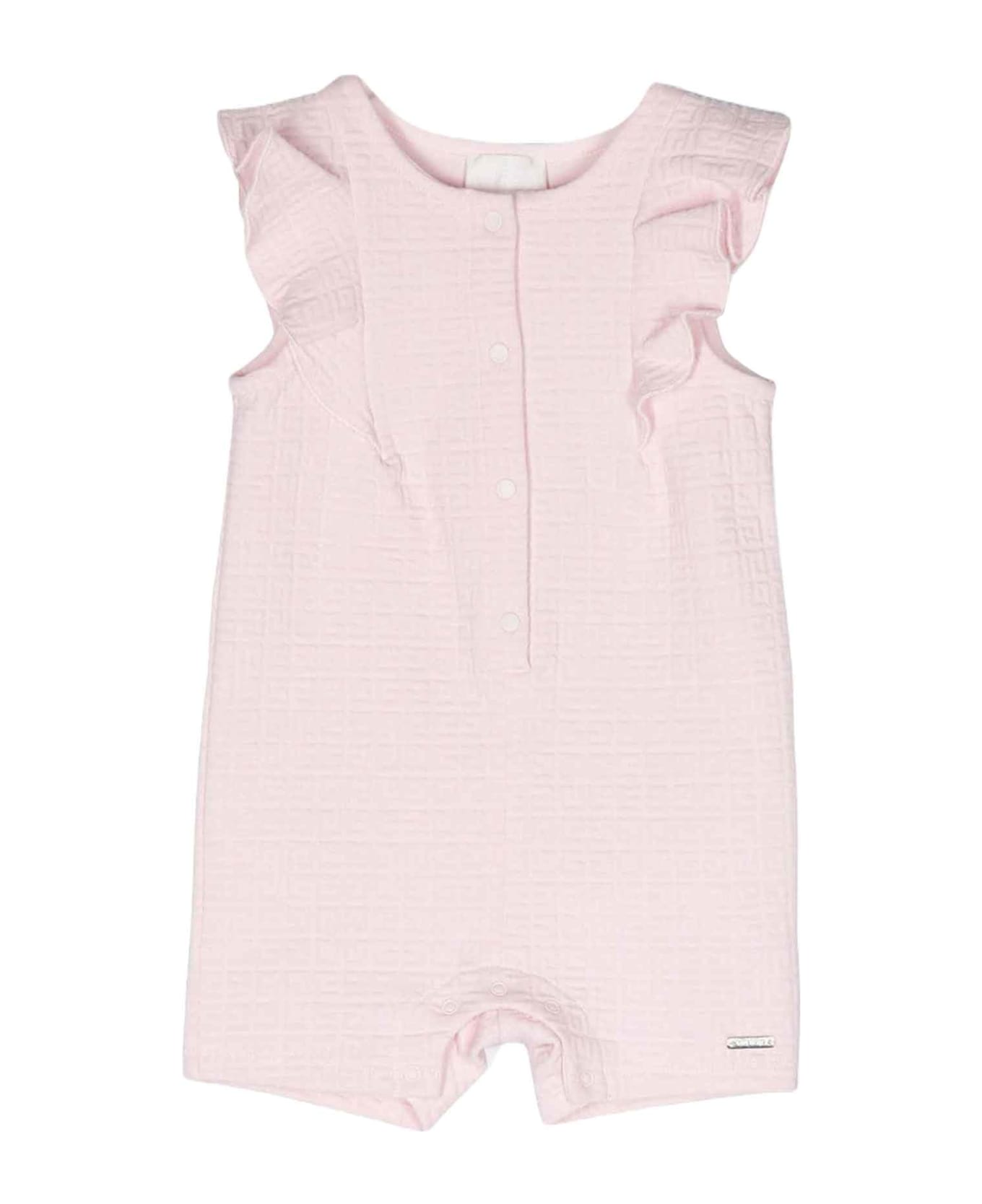 pink romper baby girl. Embossed finish, all-over embossed logo print, ruffle detail, front snap button closure, round neckline and sleeveless. Cotton 75%, Polyester 21%, Elastane 4%