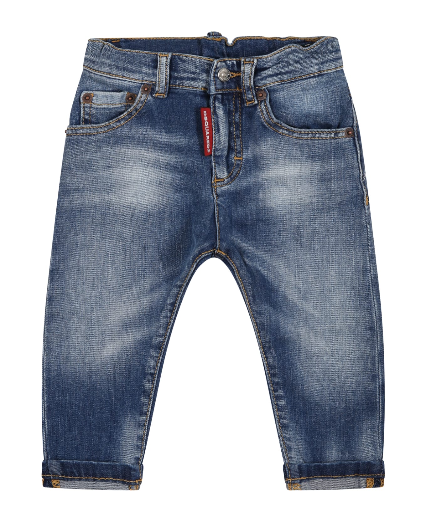 Blue denim jeans, five pockets, with belt loops, zip and button closure on the front, adjustable waist thanks to internal elastic bands with button. They are embellished with logo patch on the front and on the back.