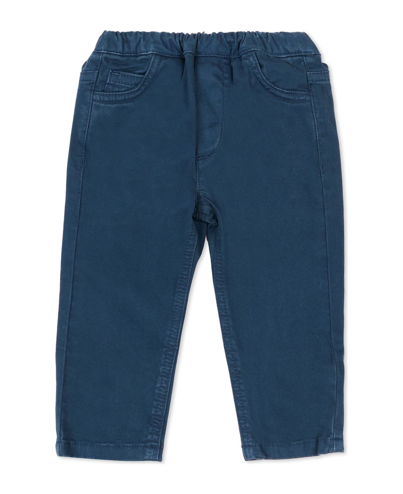 Blue cotton trousers with elasticated waistband, side pockets and back pockets.
