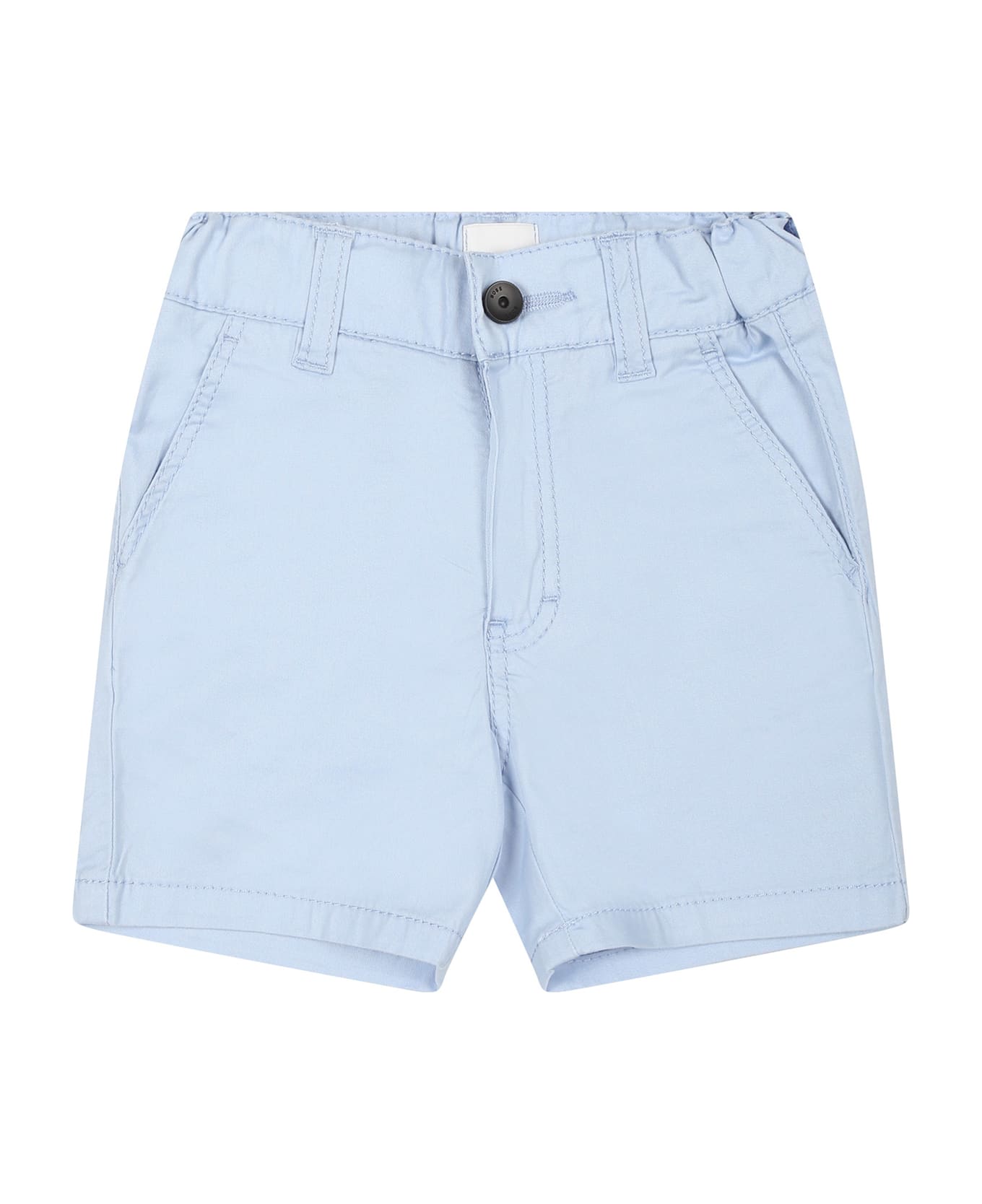 Light blue shorts in cotton blend, with elasticated waist, belt loops, welt pockets, button and zip closure on the front. They are embellished with a logo detail on the back.